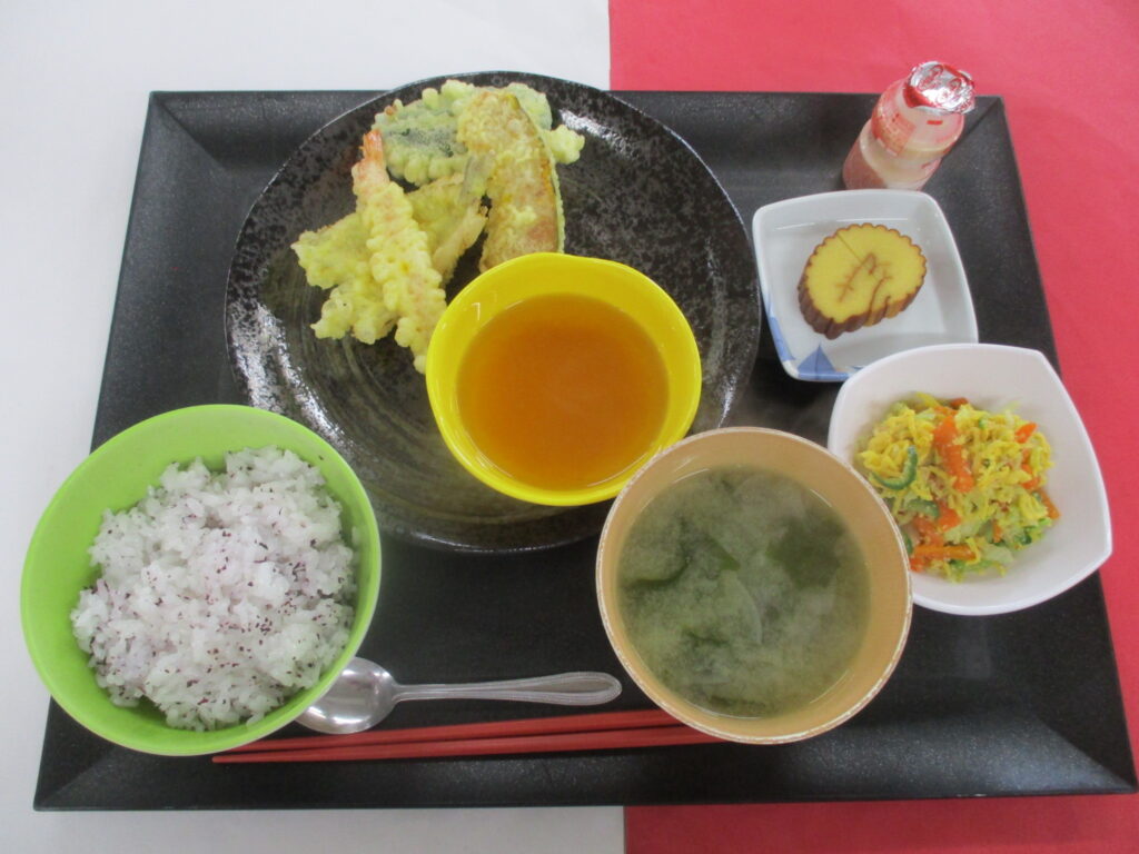 天ぷら盛り合わせ ごま酢和え ゆかりご飯 味噌汁 伊達巻🍋🍋🍋