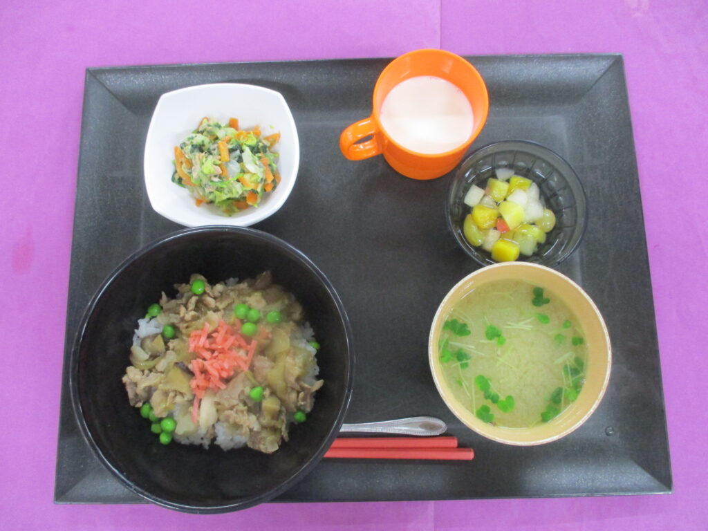 肉丼 味噌汁 白菜の和風和え 果物🥝🥝🥝