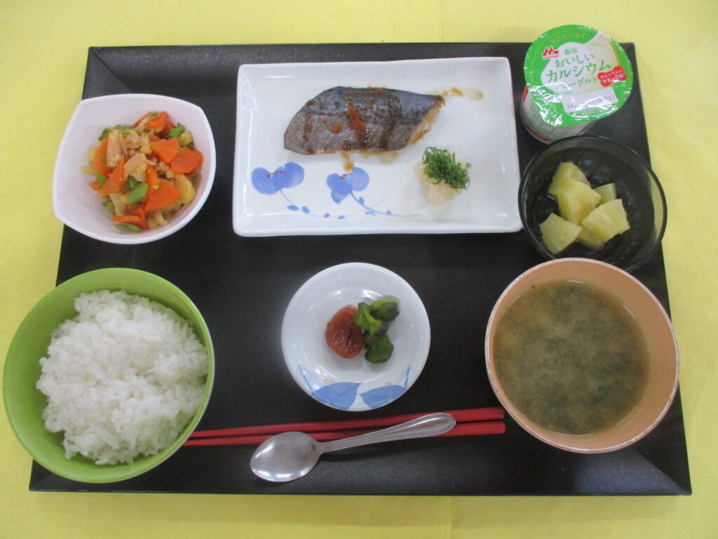 サワラの幽庵焼き 人参しりしり ご飯 味噌汁 漬物 果物🍑🍑🍑