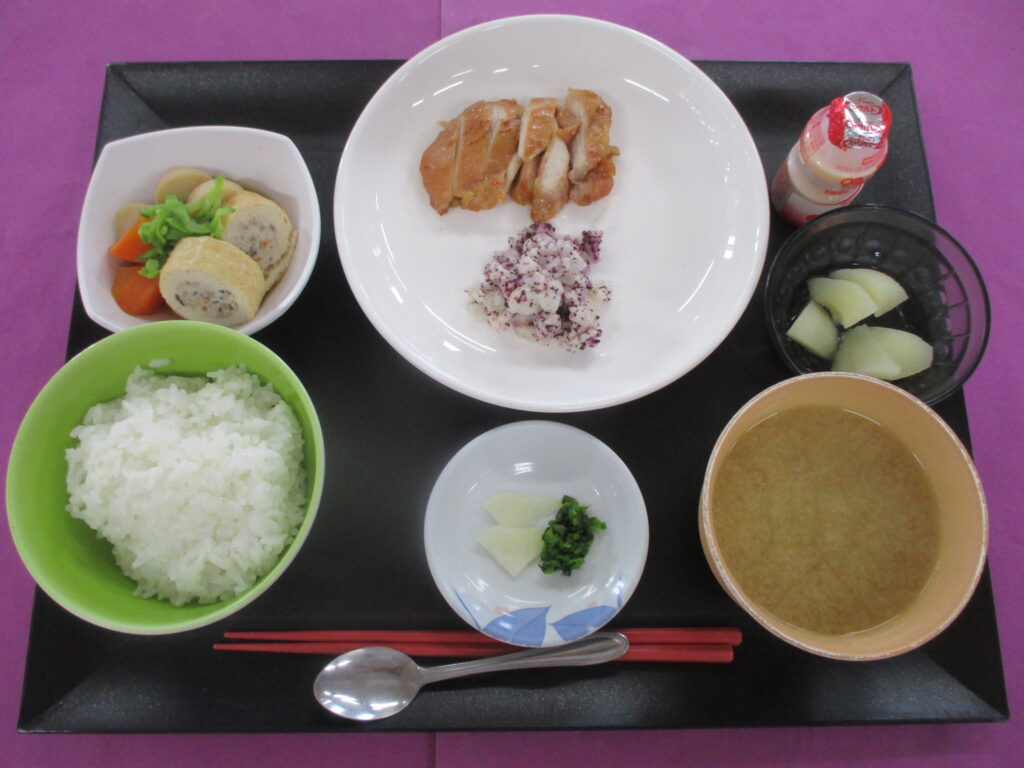 鶏の塩麴焼き 信太の煮合わせ ご飯 味噌汁 漬物 果物🍇🍇🍇