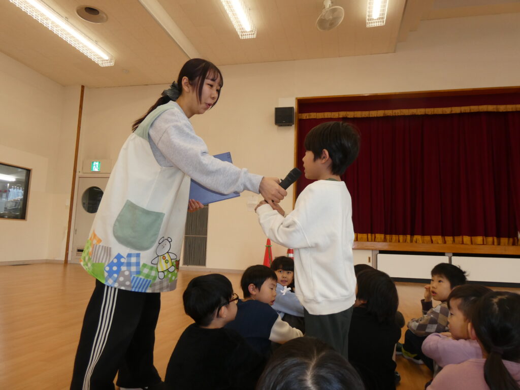 新年あけましておめでとうございます。真野第1保育園の子どもたちは「あけましておめでとうございます」「いっぱいごはんをたべたの!」「おとしだまもらっちゃった」などと元気いっぱいに年末年始での出来事を教えてくれました。新年お楽しみ会ではばら組さんが代表して新年の挨拶の仕方についてインタビューで教えてくれました。