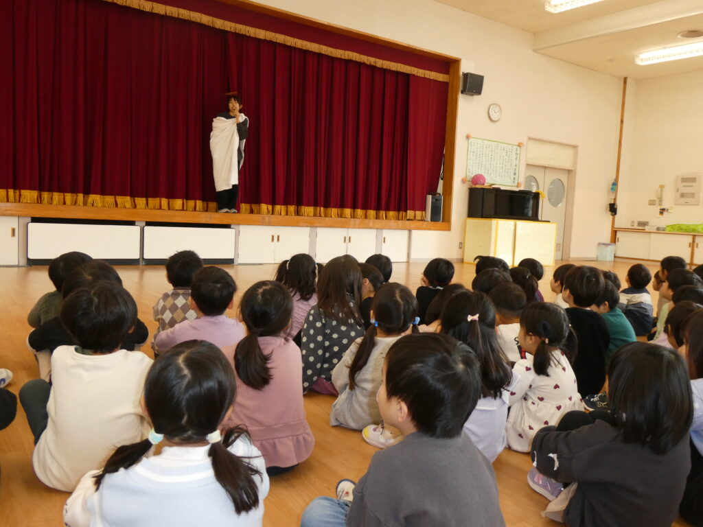 すると「元気な声が聞こえるなあ」とどこからか声がしました。ステージから神様が登場し『十二支のはじまり』の劇のスタートです!