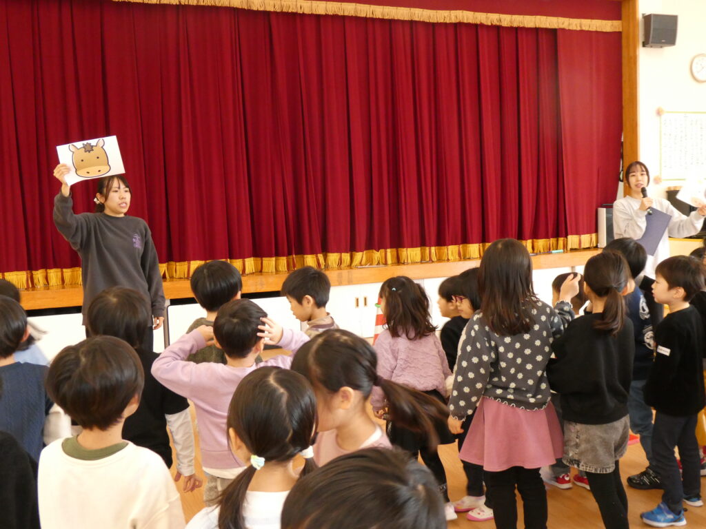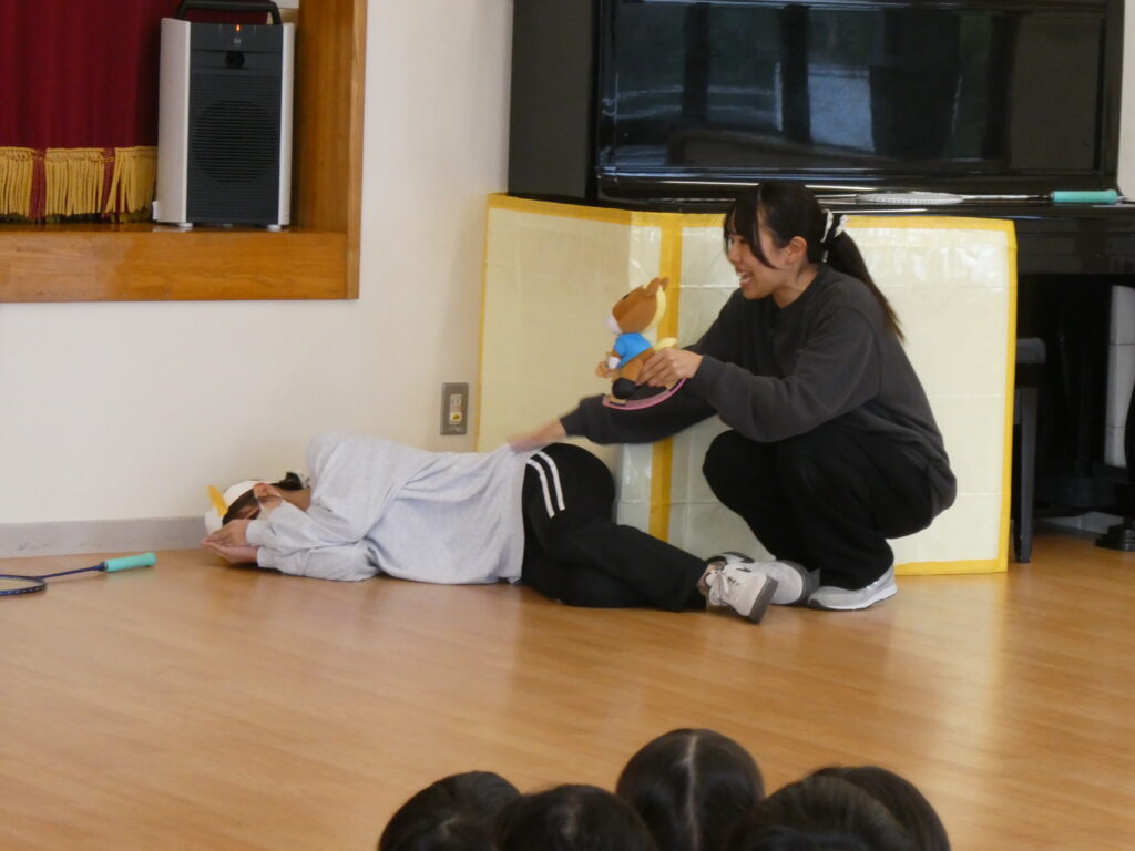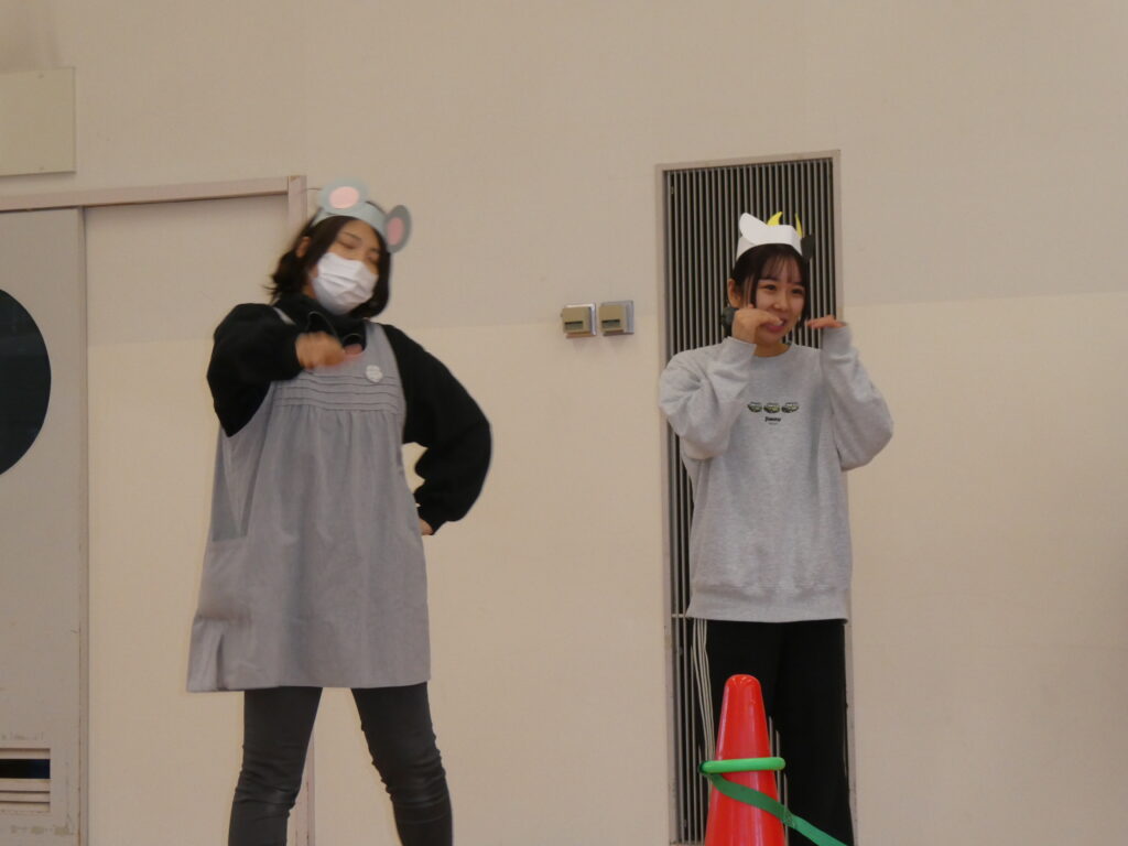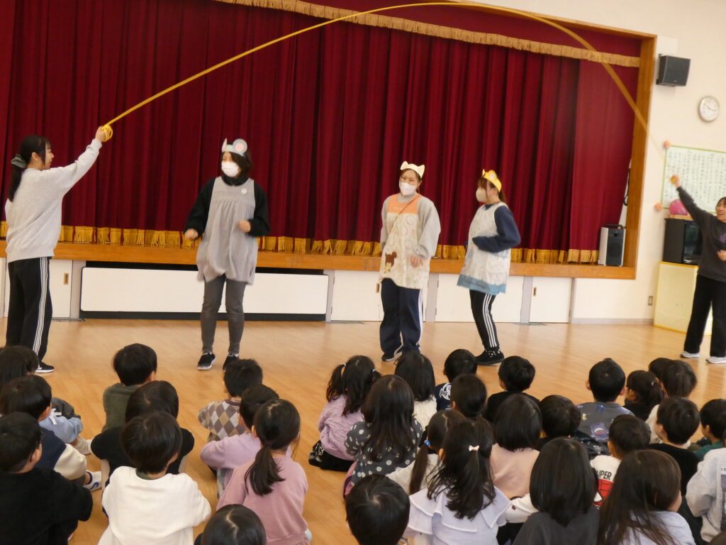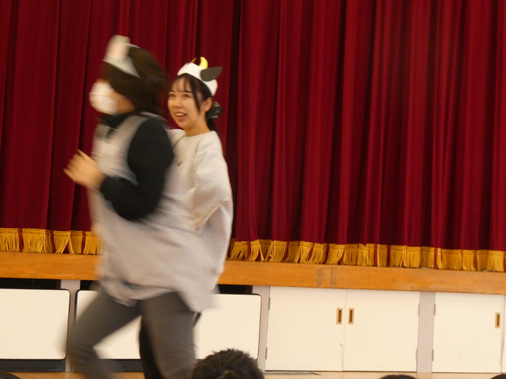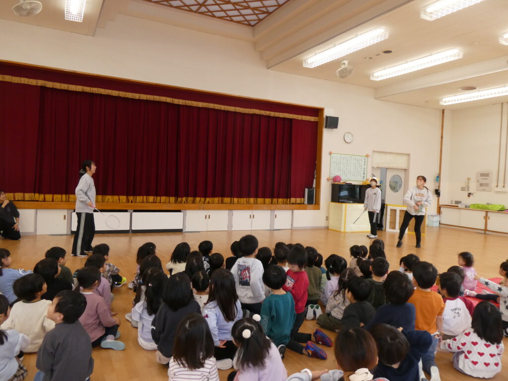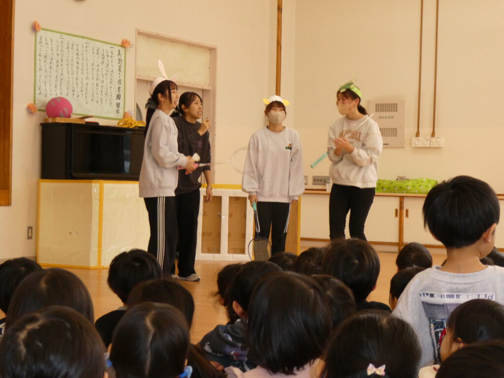 つぎにウサギさんとヒツジさん、カメさんが登場して得意のバドミントンを披露しました。「1・2・3…」と何回続くかと一生懸命に数を数えて楽しむ子どもたちです。カメさんは疲れてお家に帰り、ヒツジさんはその場で眠ってしまいました。ウサギさんのゴールです🐰