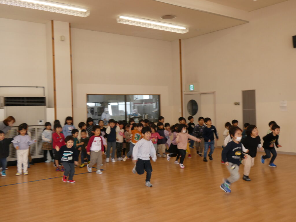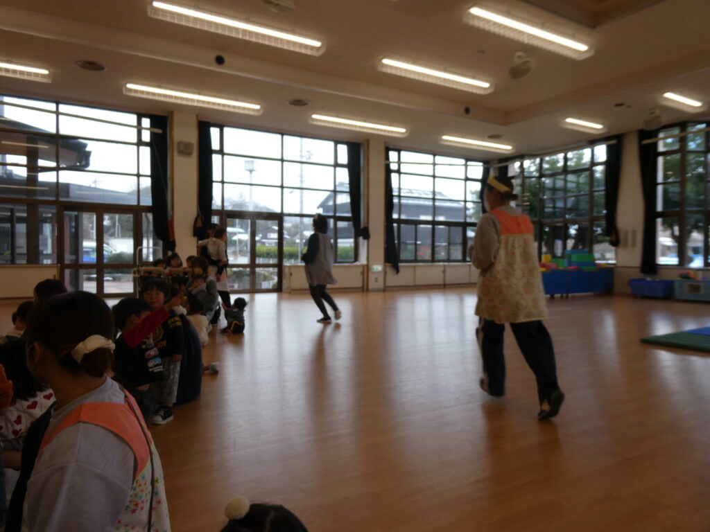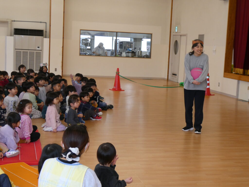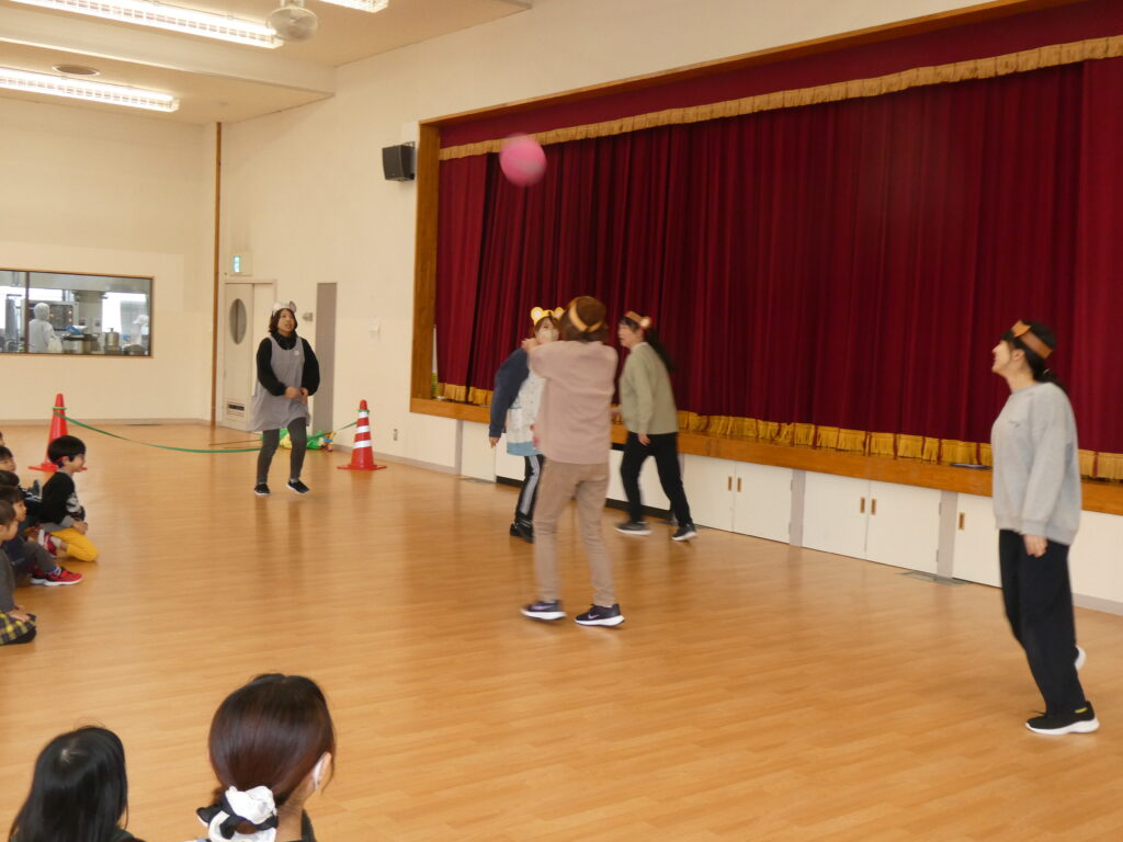 最後にイノシシさんが登場し「体を温めたいからバレーしよう!」と動物たちを誘いました。ボールのラリーが続き、子どもたちも「がんばれ~」「おしい」と優しい言葉をかけていて、ほっこりしました。そして猛ダッシュでゴールを決めたイノシシさんです🐗