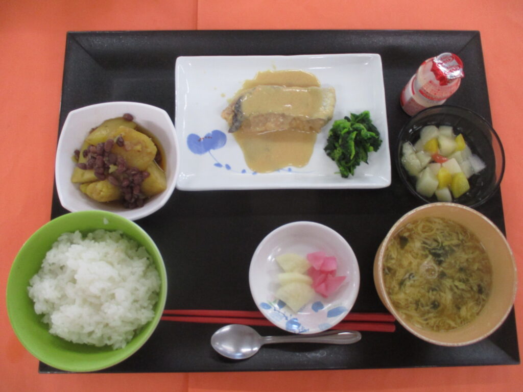 ☆小正月☆ 白身魚の粕煮 さつま芋の小豆煮 ご飯 かき玉汁 漬物 果物🍒🍒🍒