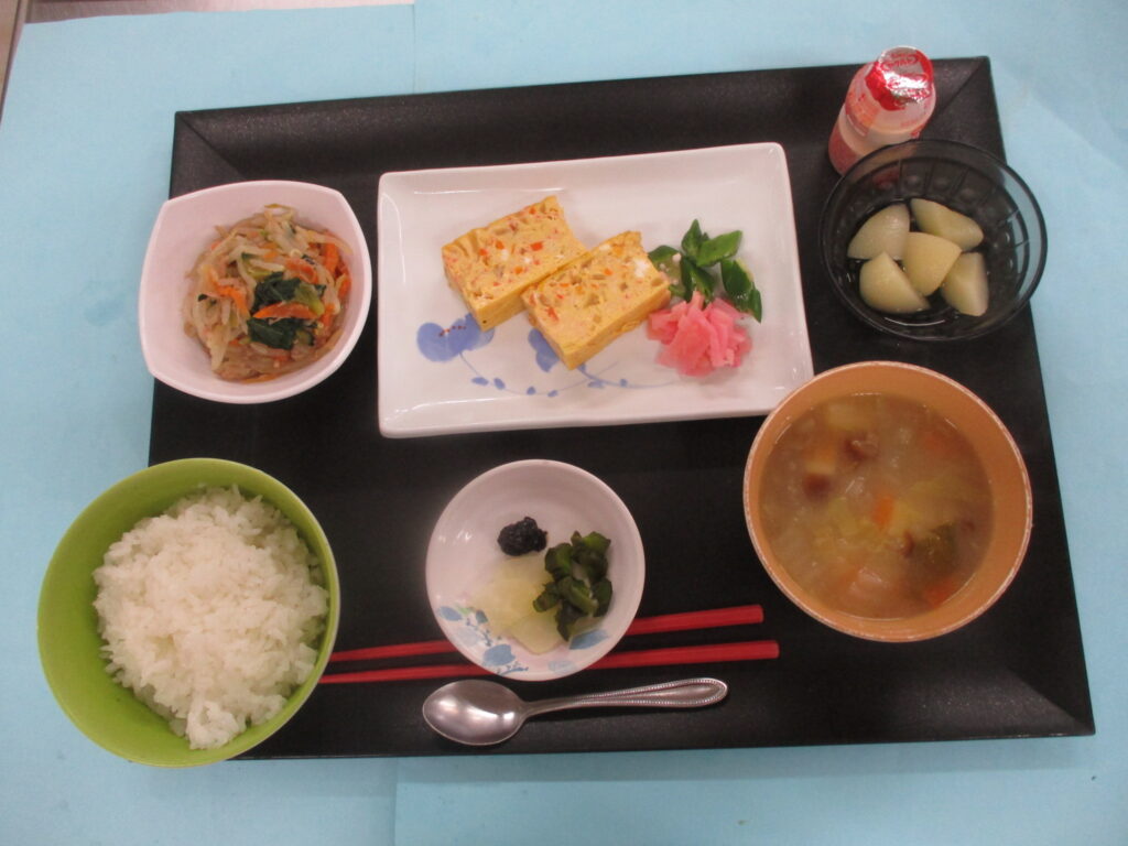 千草焼き もやしのナムル ご飯 具沢山汁 漬物 果物🍍🍍🍍