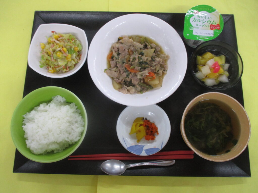 豚肉と冬野菜の味噌煮込み キャベツの和え物 ご飯 すまし汁 漬物 果物🥝🥝🥝