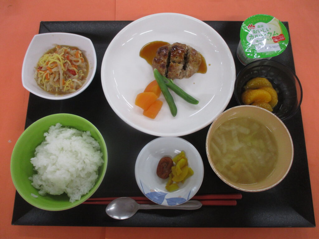 照り焼きハンバーグ もやしの和風サラダ ご飯 味噌汁 漬物 果物🍒🍒🍒