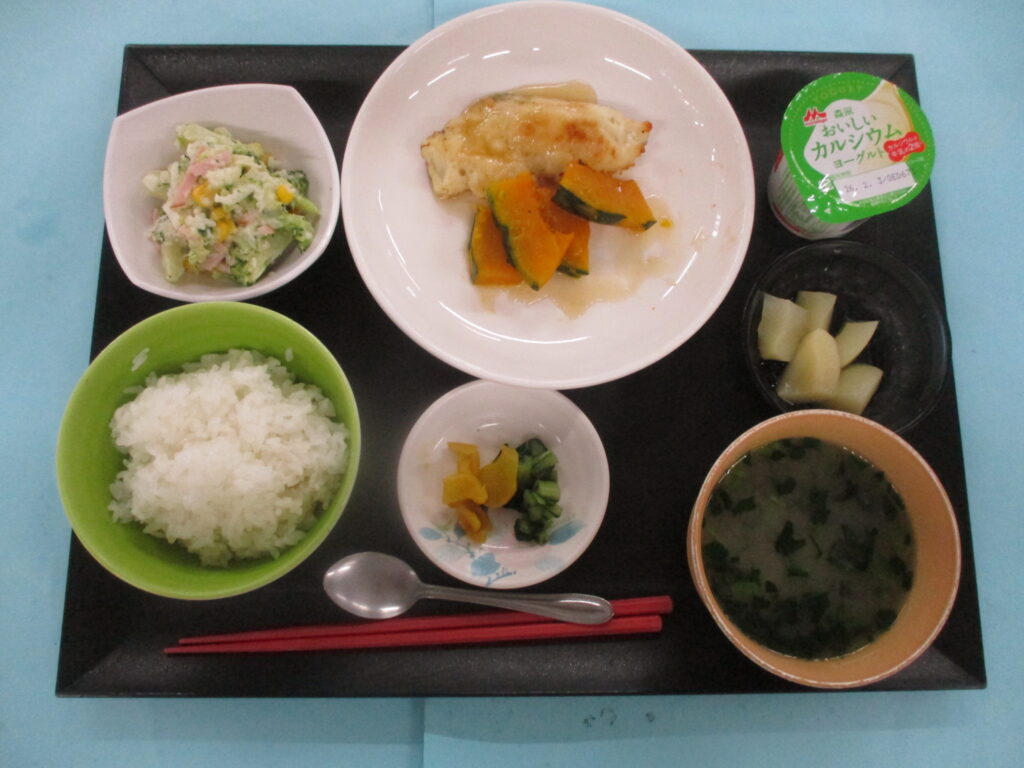 タラの和風ムニエル 花野菜のサラダ ご飯 味噌汁 漬物 果物🍑🍑🍑