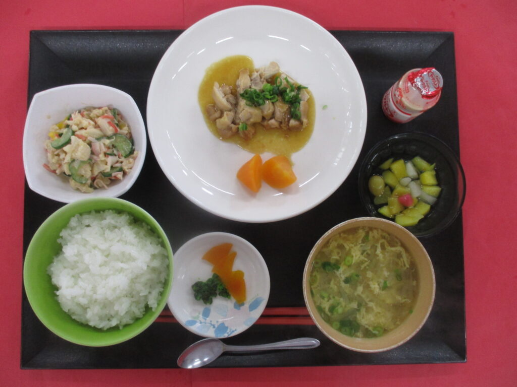 鶏肉のさっぱり煮 カニカマ和え ご飯 味噌汁 漬物 果物🍍🍍🍍