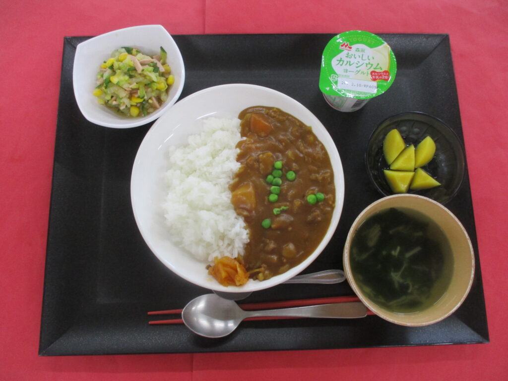 カレーライス🍛 スープ 青じそ和え 福神漬 果物🥝🥝🥝