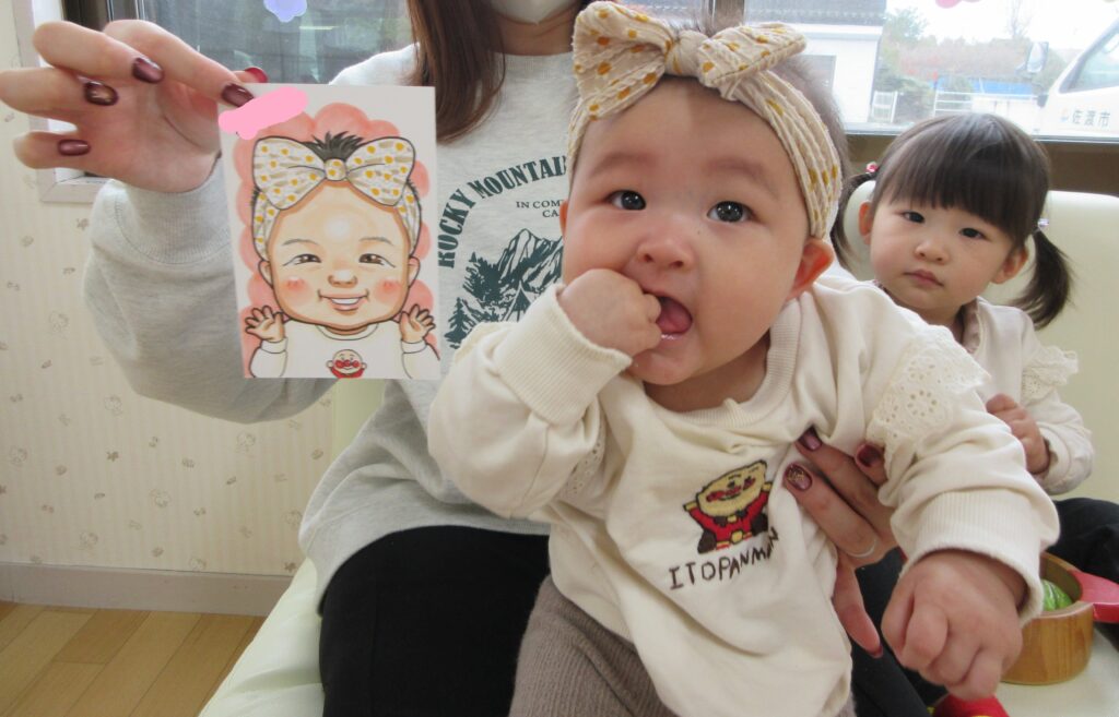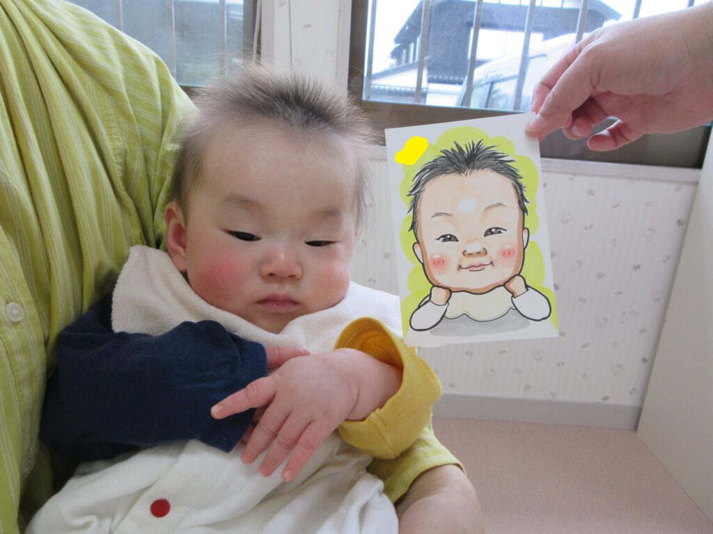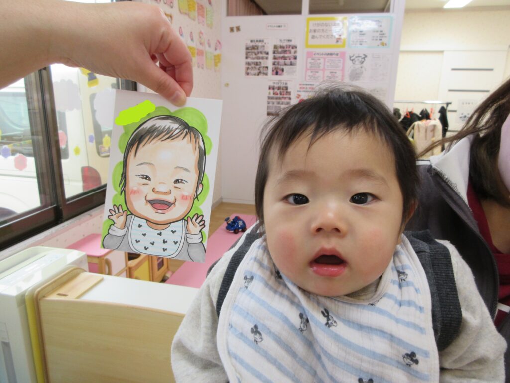 講師の先生にお子さんの似顔絵を描いてもらうことができ、お母さん方はとても喜んでいました。お子さんの特徴をしっかりと捉えていて、そっくりな似顔絵に驚いた表情を見せる方もいました。