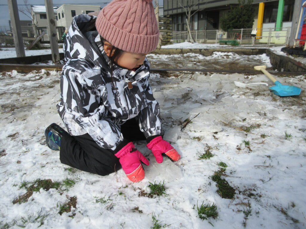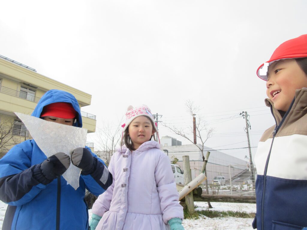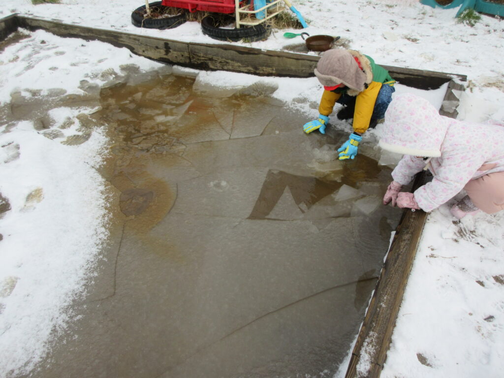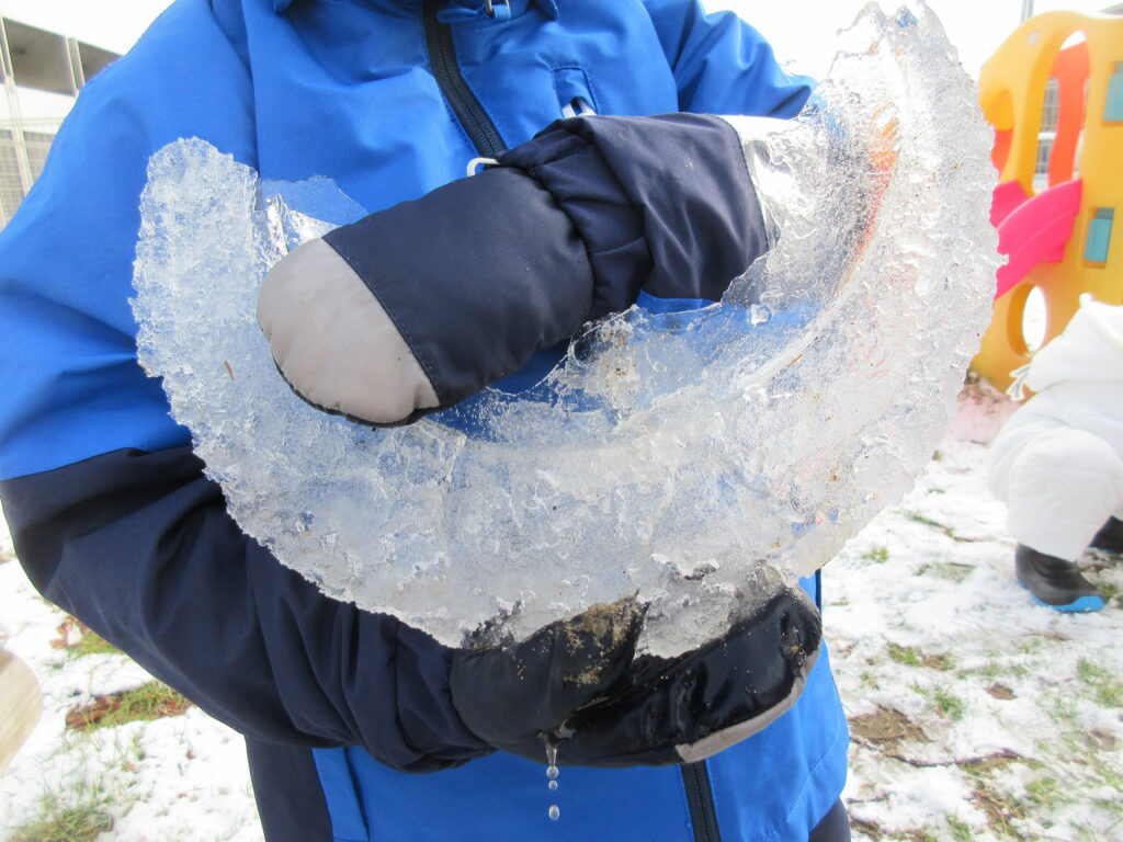 砂場や砂遊びの道具に溜まった水が凍っているのを見つけ、大きなものや面白い形を発見!