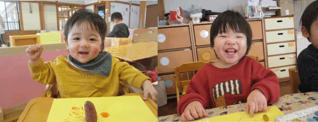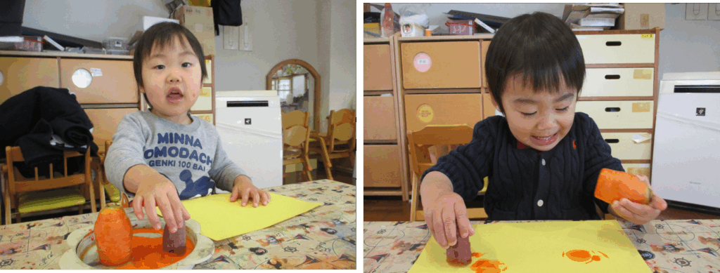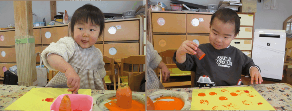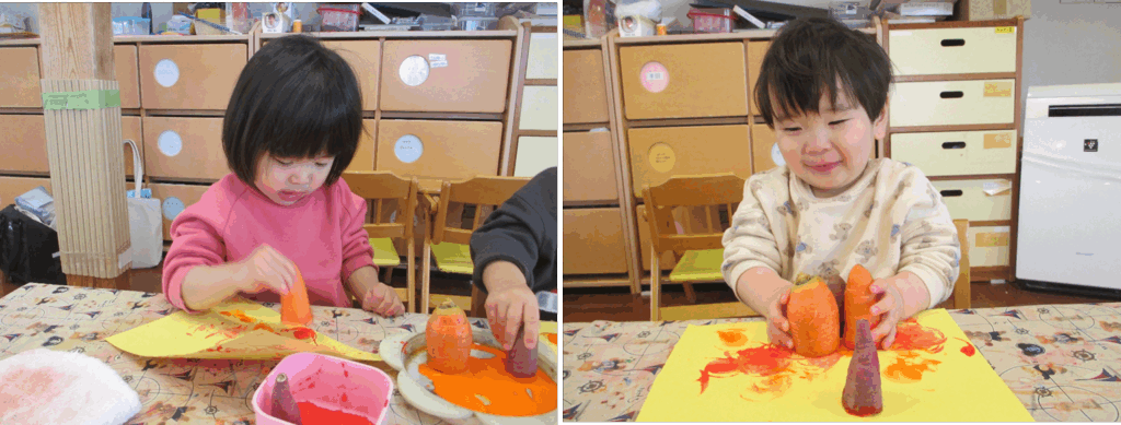 今日はにんじんやさつまいもを使ってハンコ遊びをしました。