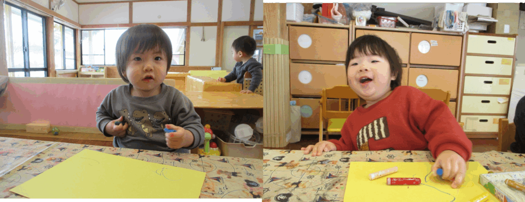 筆を使って線を楽しむ子やクレヨンでグルグル描きを楽しむ子など楽しみ方も色々です。