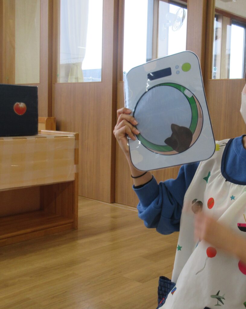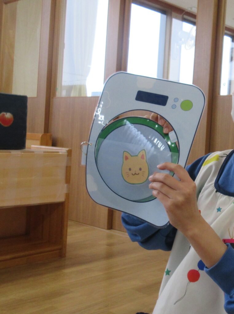 洗濯機の中の黒い影を見て「ネコ!」「にゃんにゃん!」と答えてくれる子どもたち