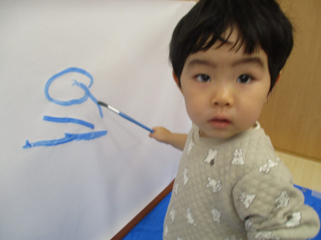 表現がとても豊かになりましたね!文字のようなものを描くなど、力加減を調節し、滑らかに筆が動かせるようになったことに成長を感じます。表現したものを「みて~」と伝え、たくさん気持ちを受け止めてもらって嬉しそう。