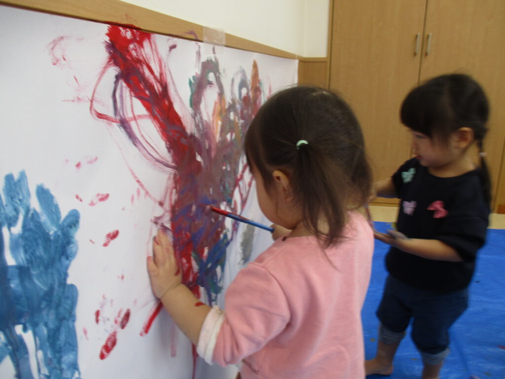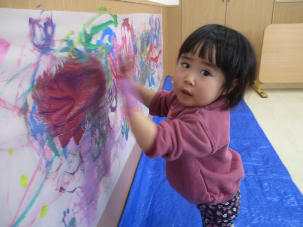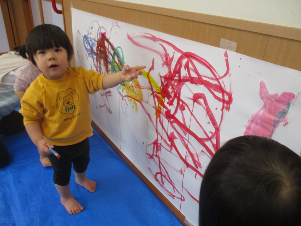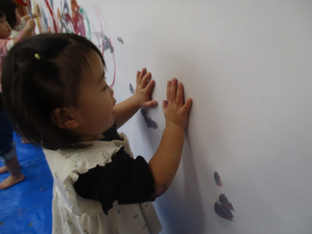 紙に手をつけ離して・・・その手の平に残る感触が楽しくて何度も何度も繰り返す姿がありました。手のひらや腕、足にもアートが・・・楽しかったね!