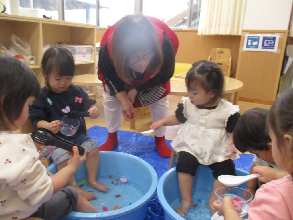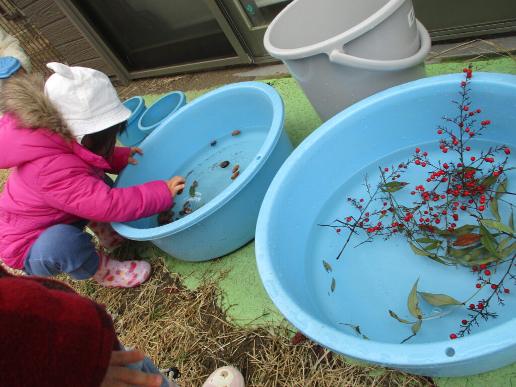 今回のお楽しみは、前日にタライなど季節の草花やどんぐりをいれ、水をはって『氷』ができるかな…氷遊びがしたいな…と思ったのですが、残念ながら氷が張っておらず、絵の具遊びや足湯など各チームでやりたいことを楽しみました。