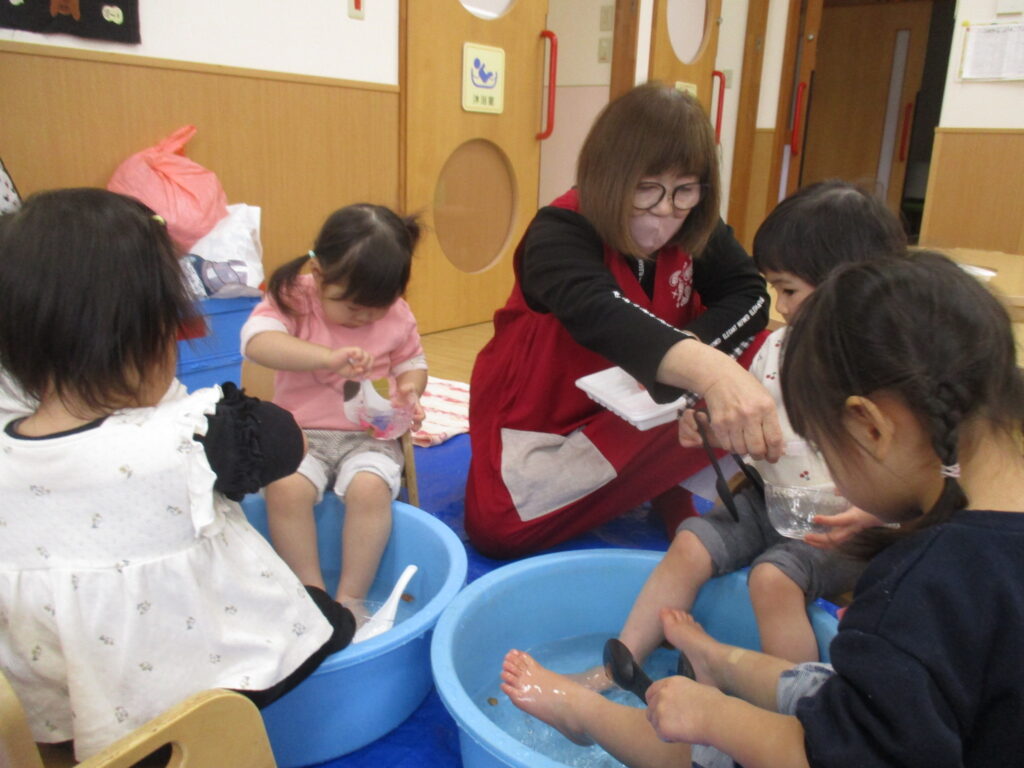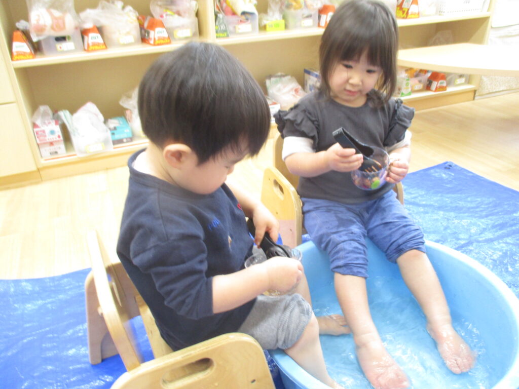 『さむい』『あたたかい』など身体で感じたことを言葉にしながら楽しみます。入った瞬間「あったか~い」「きもちいい~」