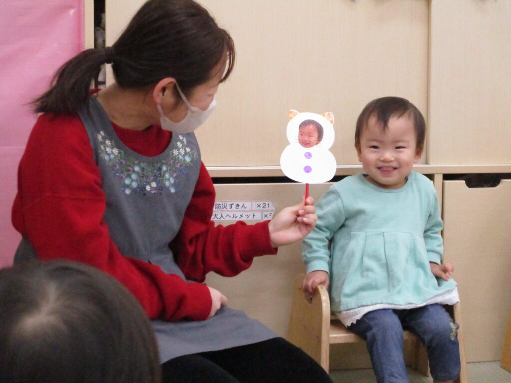 1月生まれのお友だちの誕生会がありました。今回は『雪だるまのちゃちゃちゃ♪』の曲に合わせてゾウと猫のペープサートが登場。