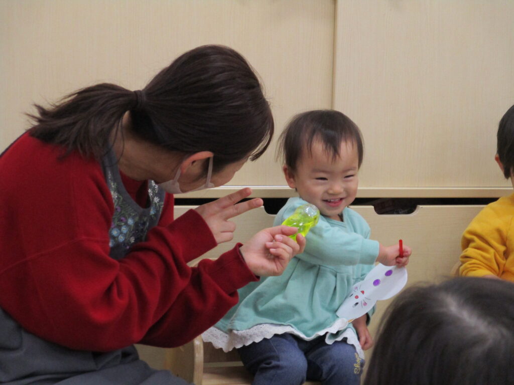 皆で「でておいで~」と呼ぶとくるっと変身!誕生児のお顔が登場すると嬉しくてニッコリ。