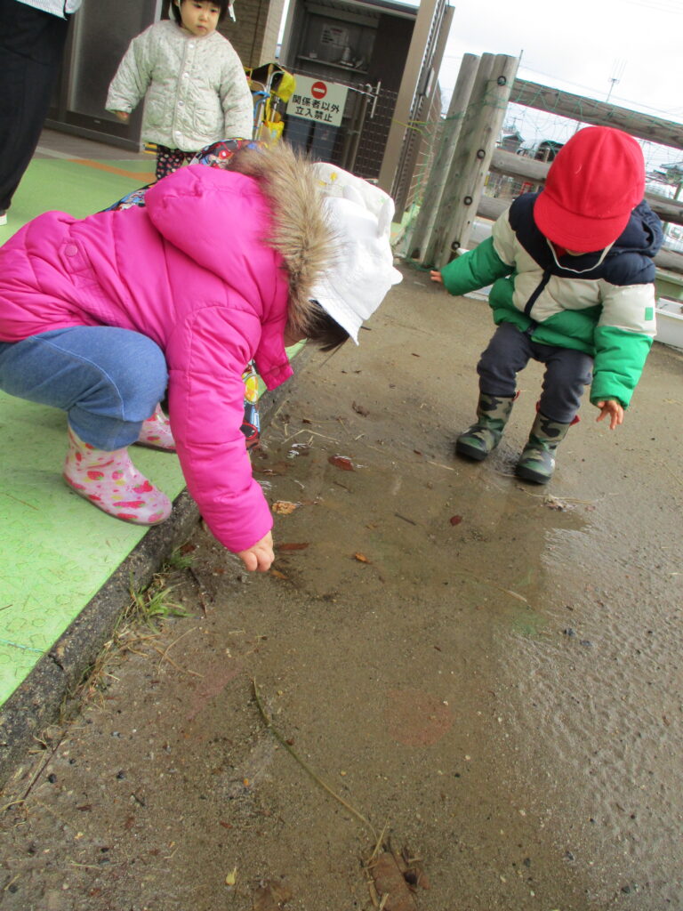 園庭のあちこちに水たまりが出来ていて、触ってみて…「できてないわ!」「つめたい!」いつもの水よりさらに冷たいことに気づきます。