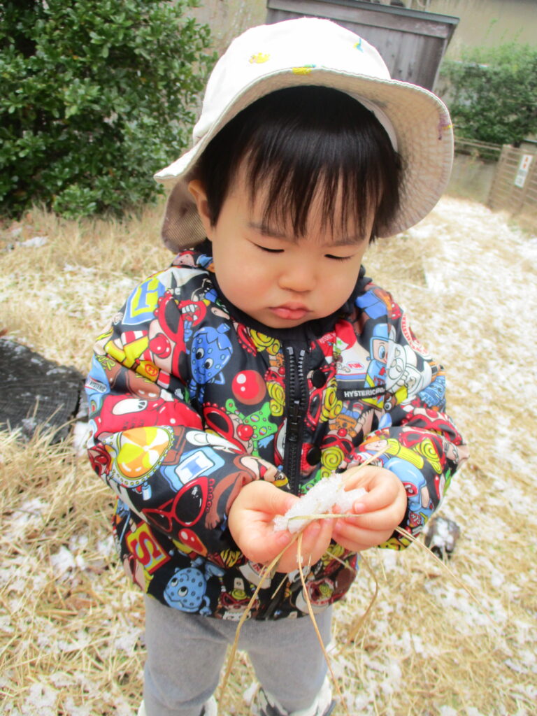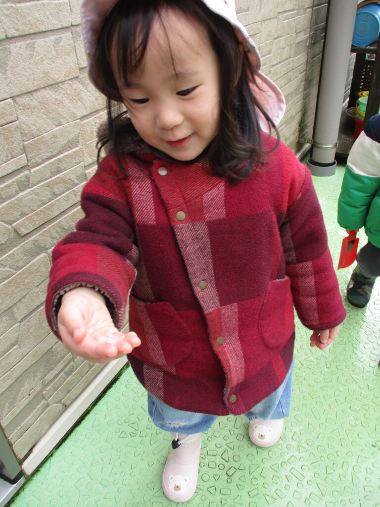今朝ほんの少しだけ降った雪が残っていて、雪の結晶を見つけては「これこおり?」と聞いていました。