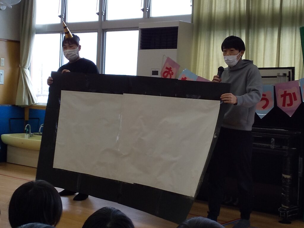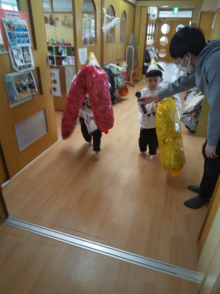 先生からの出し物では、おなかの空いた鬼さんに恵方巻を作りました。