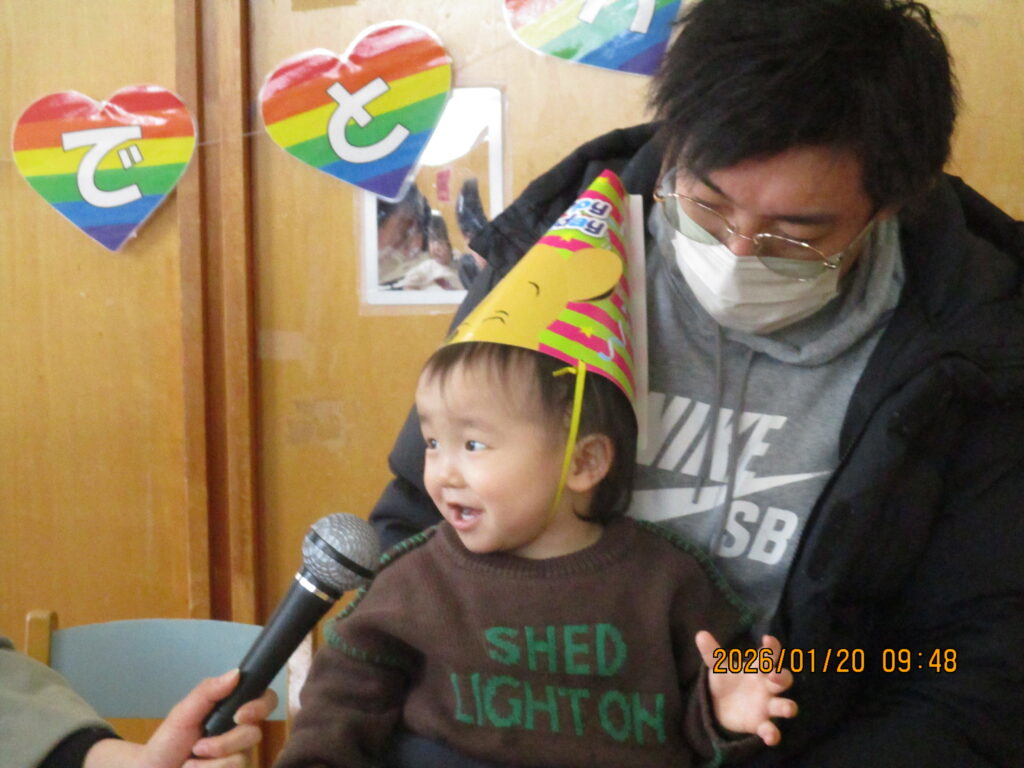1月生まれのお誕生会がありました。今日はいちご組(1歳児)のお友達が主役👑こちらはインタビューの時の様子ですが、名前や好きな色をとっても上手に答える姿が見られました!