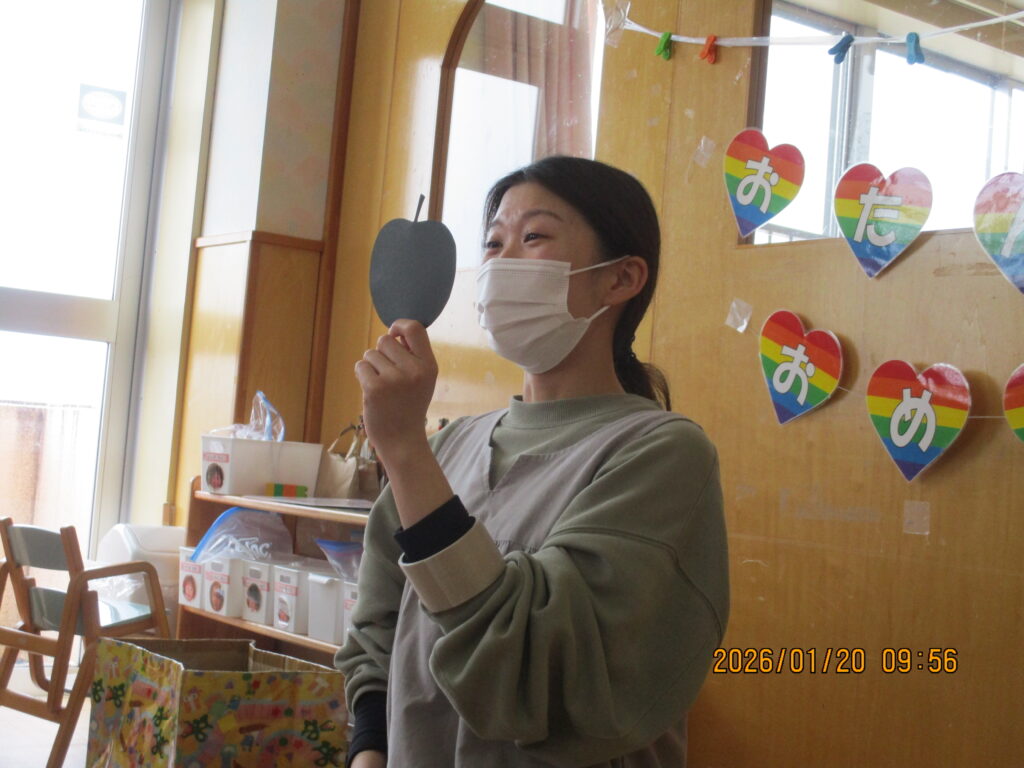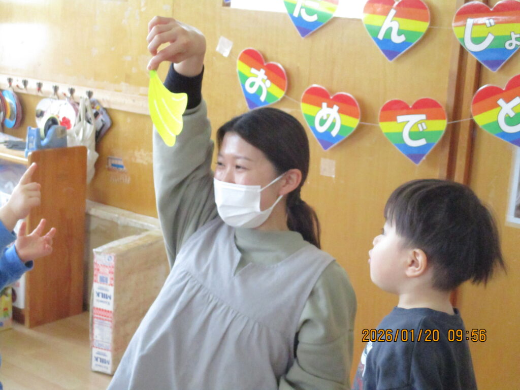 何やら黒くて不思議な形のものが登場!「これはなんだろう?」とみんなで予想し、正解が分かると「バナナだー!」「わーい!」と大盛り上がりの子どもたちでした♡