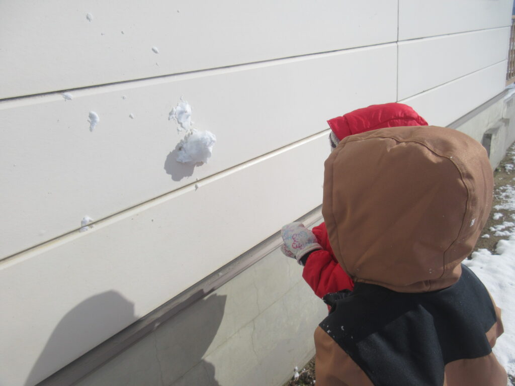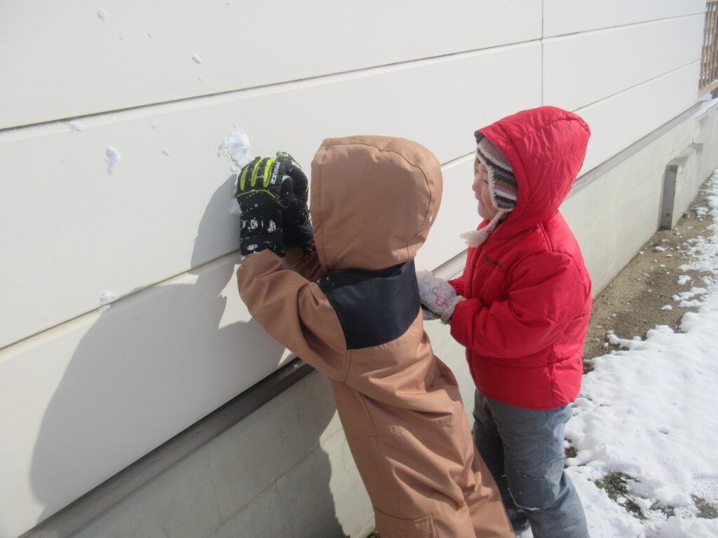「雪だるま作れないから~」と壁に雪を押し当てて顔づくり😊「おしりみたいになっちゃった!!」と大笑い。