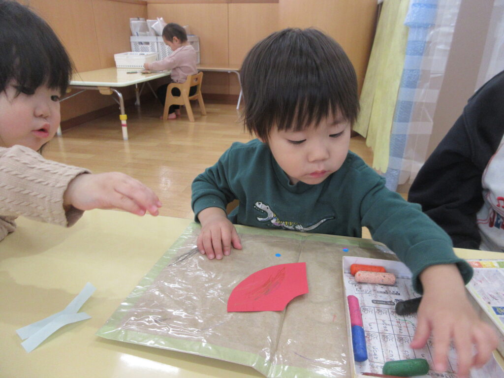 お部屋で以前からシール貼りをしたり最近ではお絵描きを楽しんだりする姿から、自由に好きな色のシールやクレヨンを使って制作も楽しみました♪小さなシールも自分で台紙から剥がそうと集中していました。