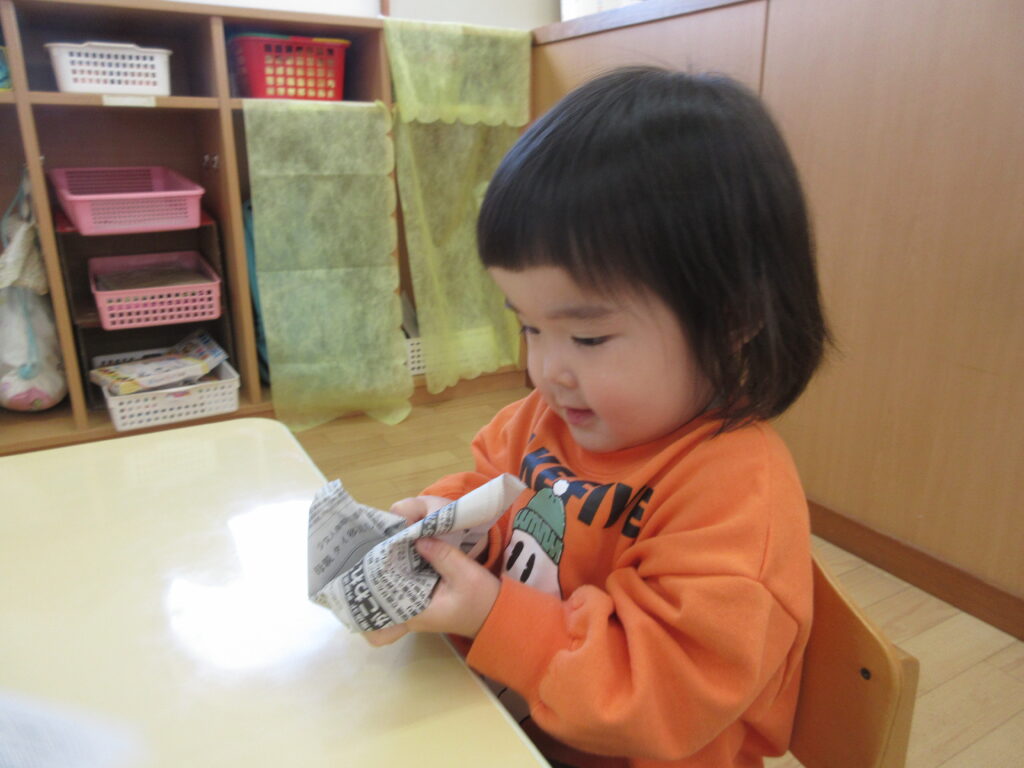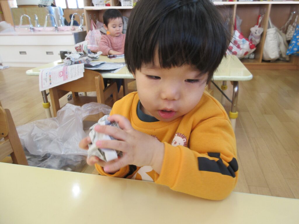 「おにぎりを作るみたいに丸くするんだよ」と伝えると、上手にぎゅっぎゅっと握っていました!以前新聞紙遊びを楽しんだ経験からビリビリと破き、細かくなった新聞紙を丸めるお友だちもいましたよ~!