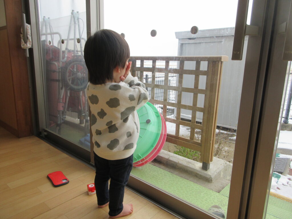 窓に自分の姿が映ることに気がついたお友だち。大好きな「トントントントンアンパンマン」の手遊びを窓を見ながら夢中で楽しんでいました😊