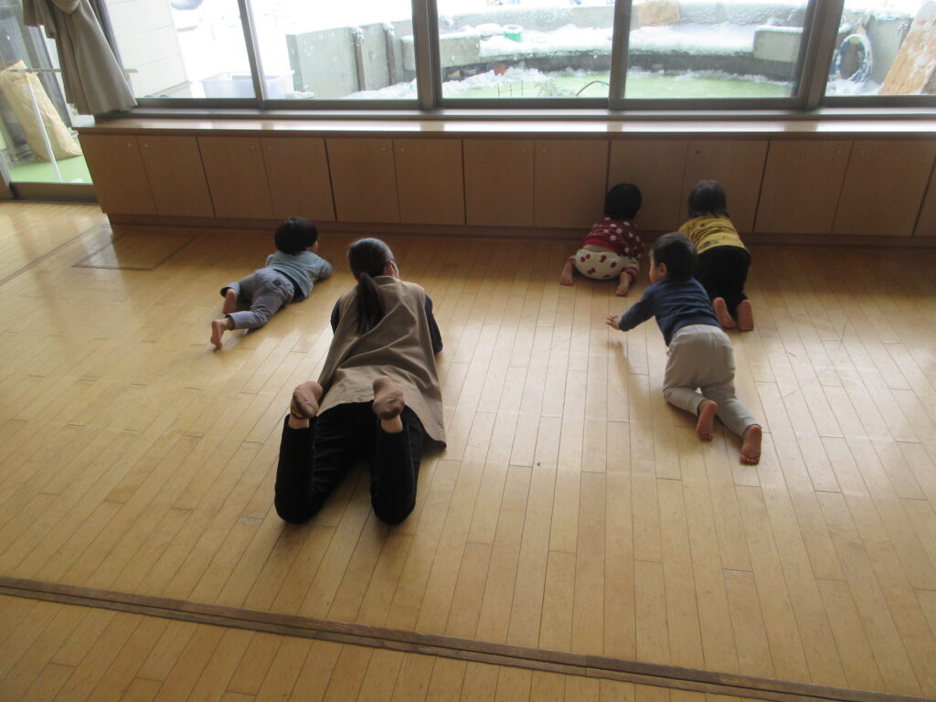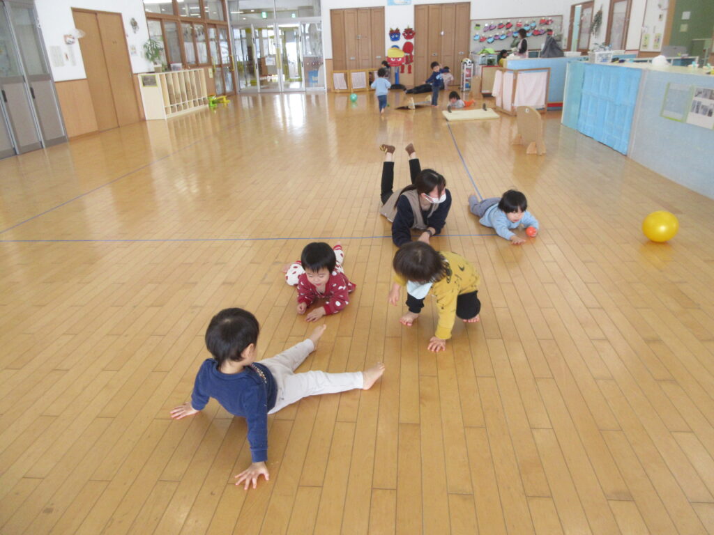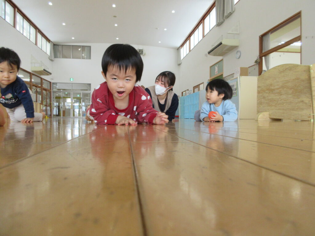 たくさん体を動かしてみんな疲れたようでごろ~んとしていると、腕の力だけでぐんぐん進もうとするお友だちがいました!足は使わず、「よいしょ、よいしょ」と進んでいきます。