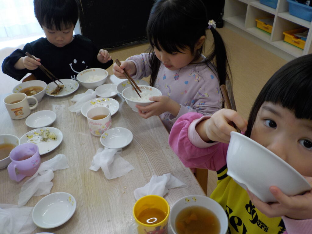 ほし組(3歳児)は箸を使って食べることに挑戦しています。