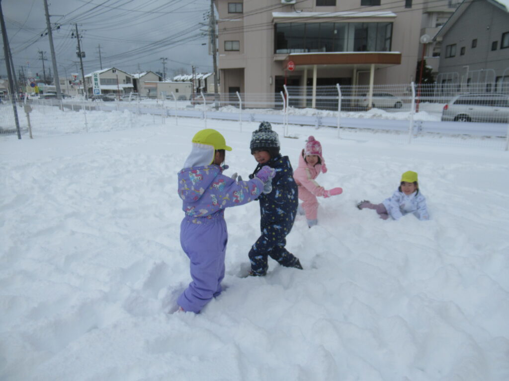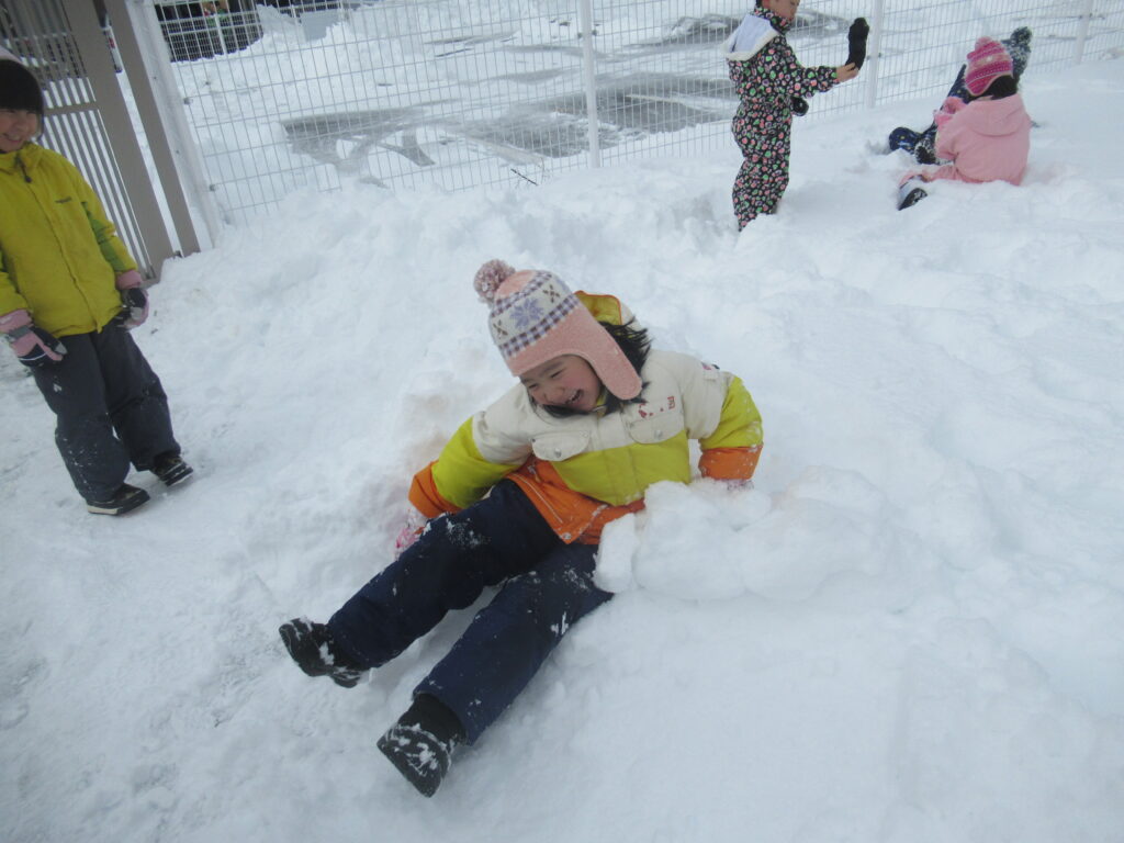 たくさん積もりましたね~!まっさらな園庭に一番乗りをして雪遊びを楽しみました