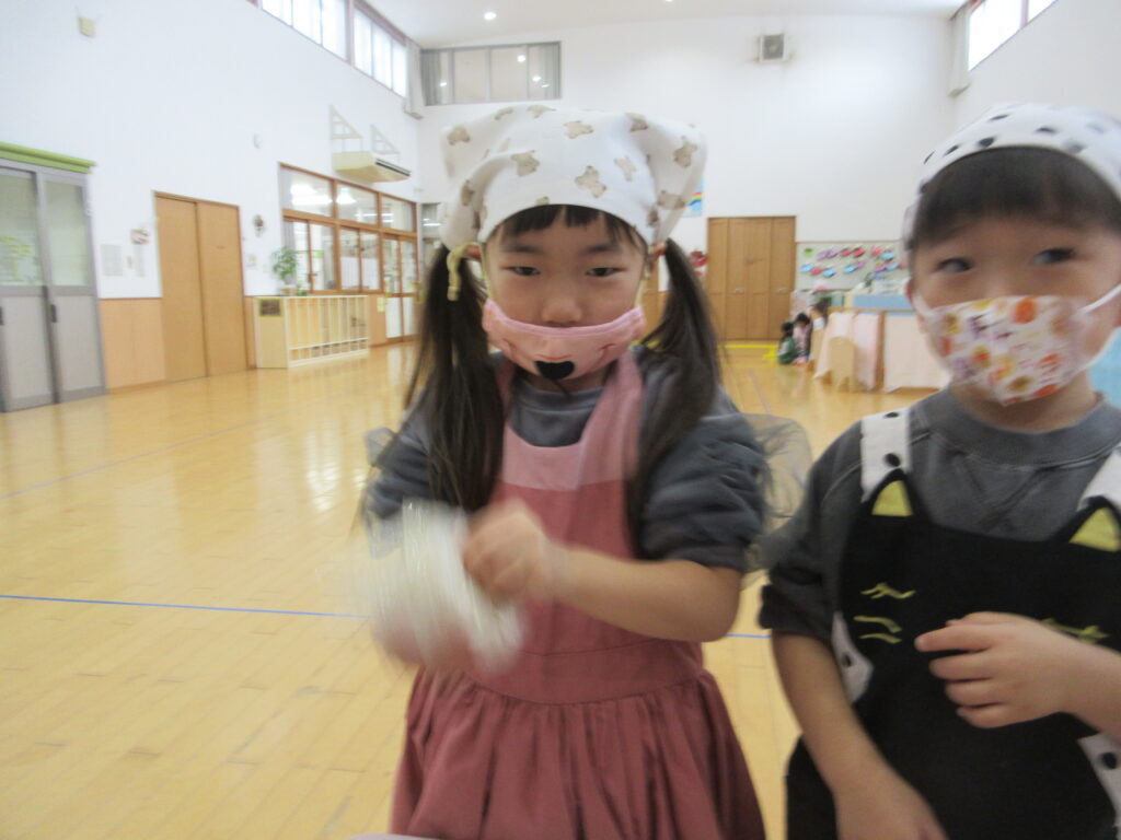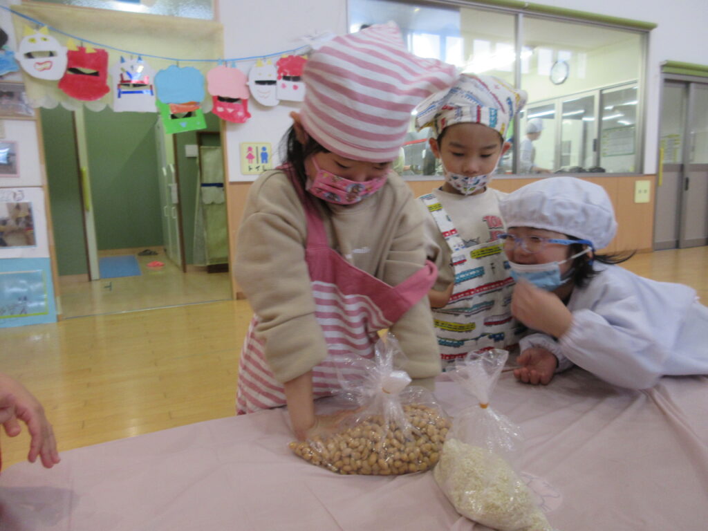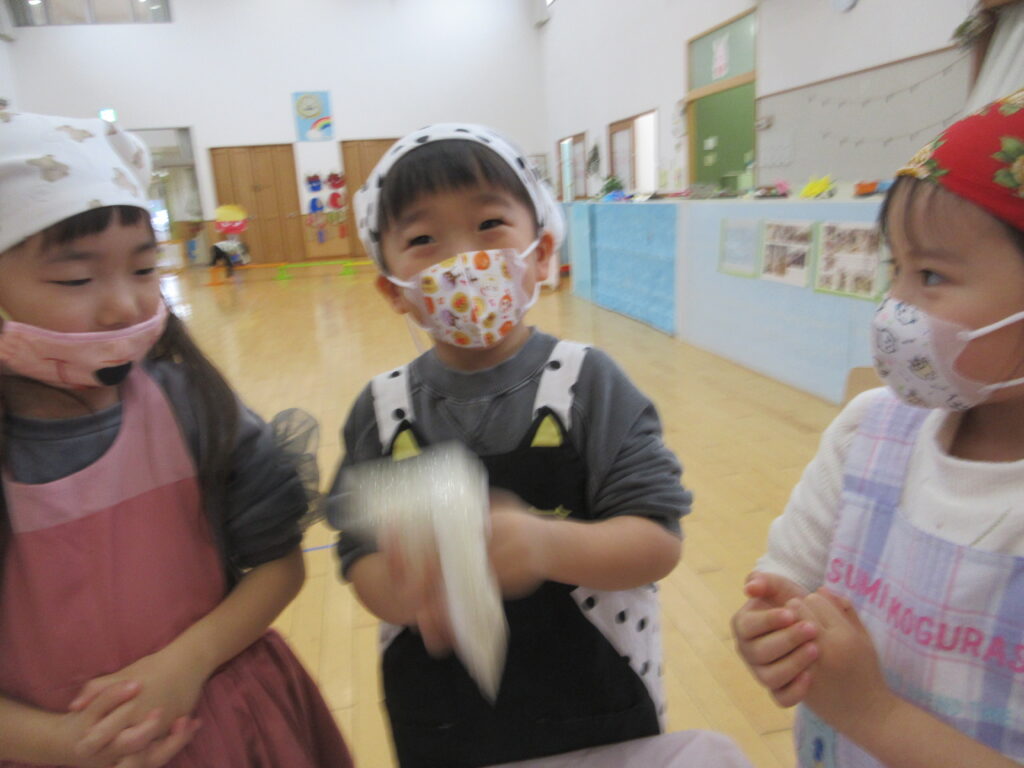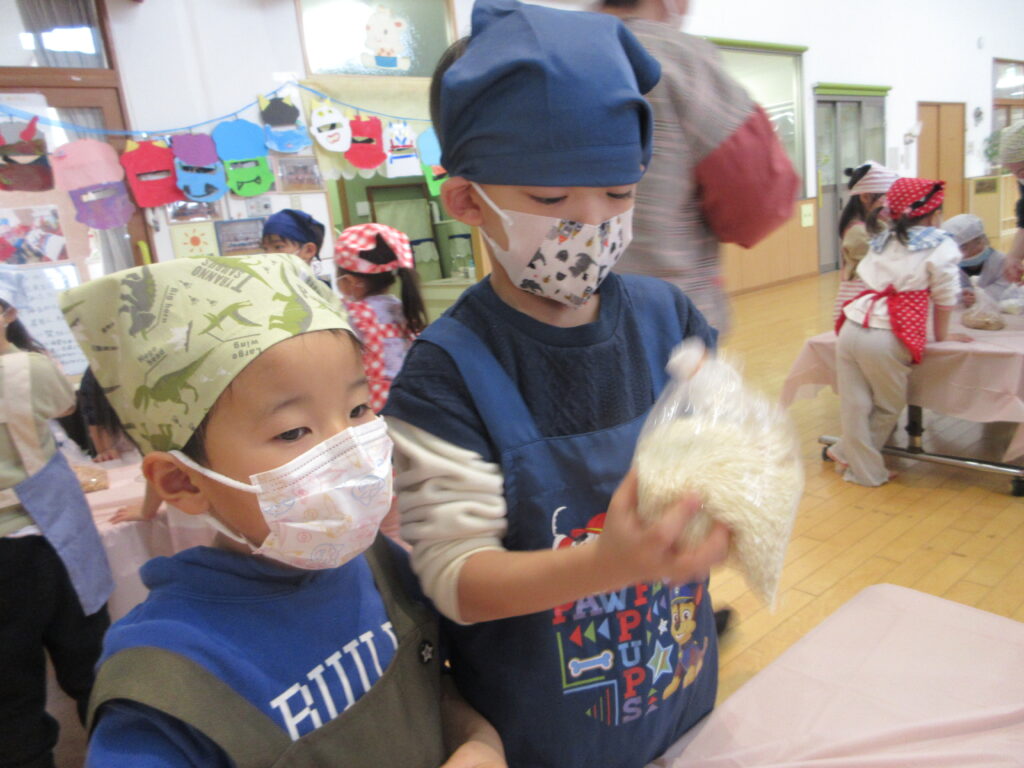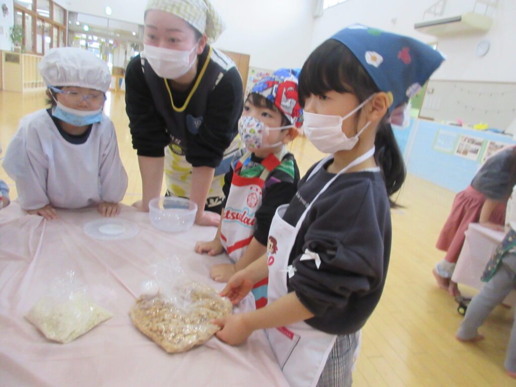 袋を開けるとふわっと麹の匂いがしました!子どもたちは「なにこのにおい」「いいにおいする~」と普段嗅ぎ慣れないにおいに興味津々。