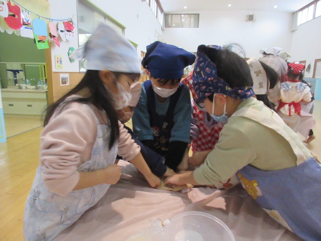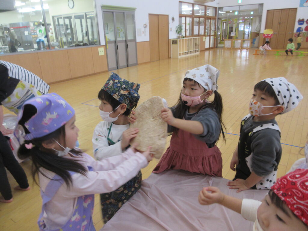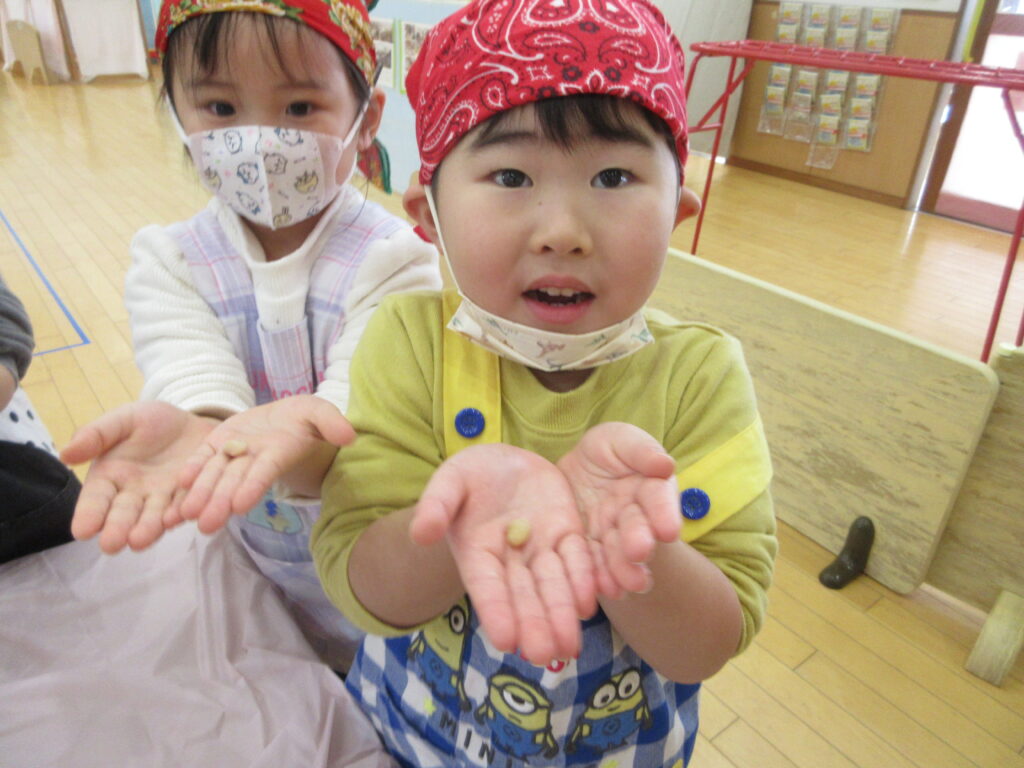 さて!大豆を潰していきます。袋の上から大豆の粒がなくなるようにみんなで頑張りました。