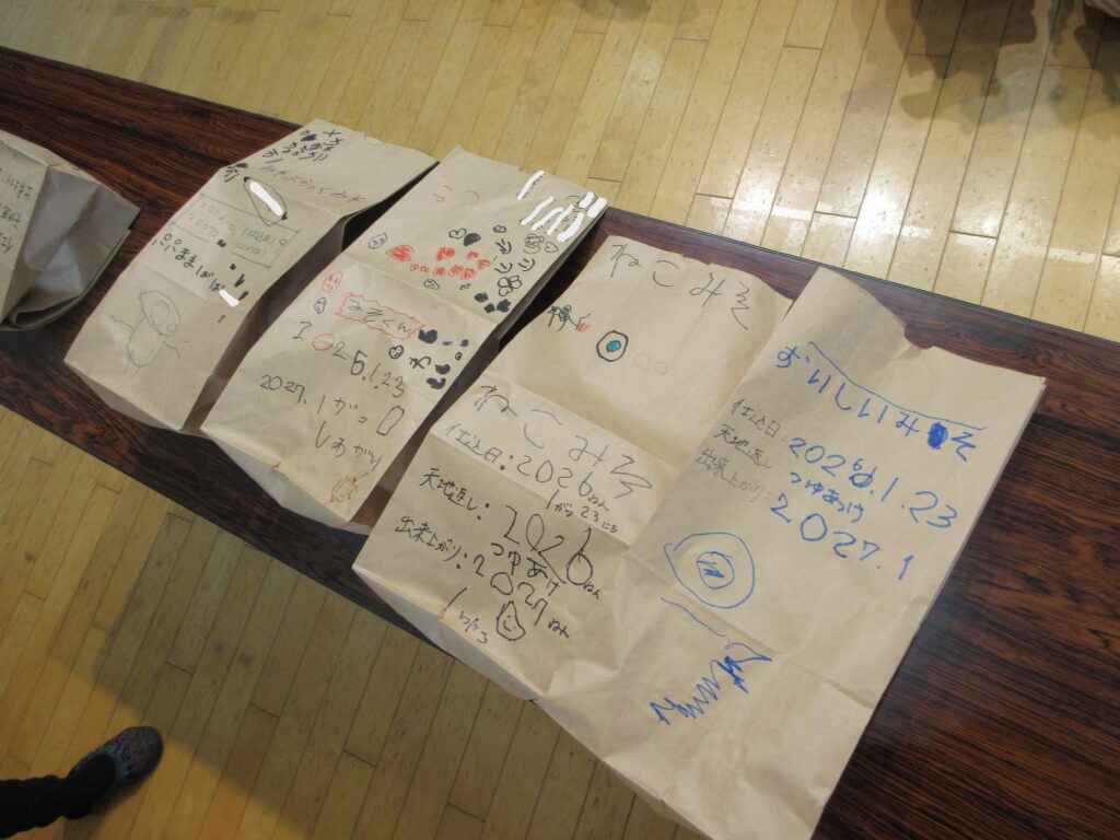 みんなで作ったみそに名前をつけ、袋に作った日の日付や食べられる時期を書きました!