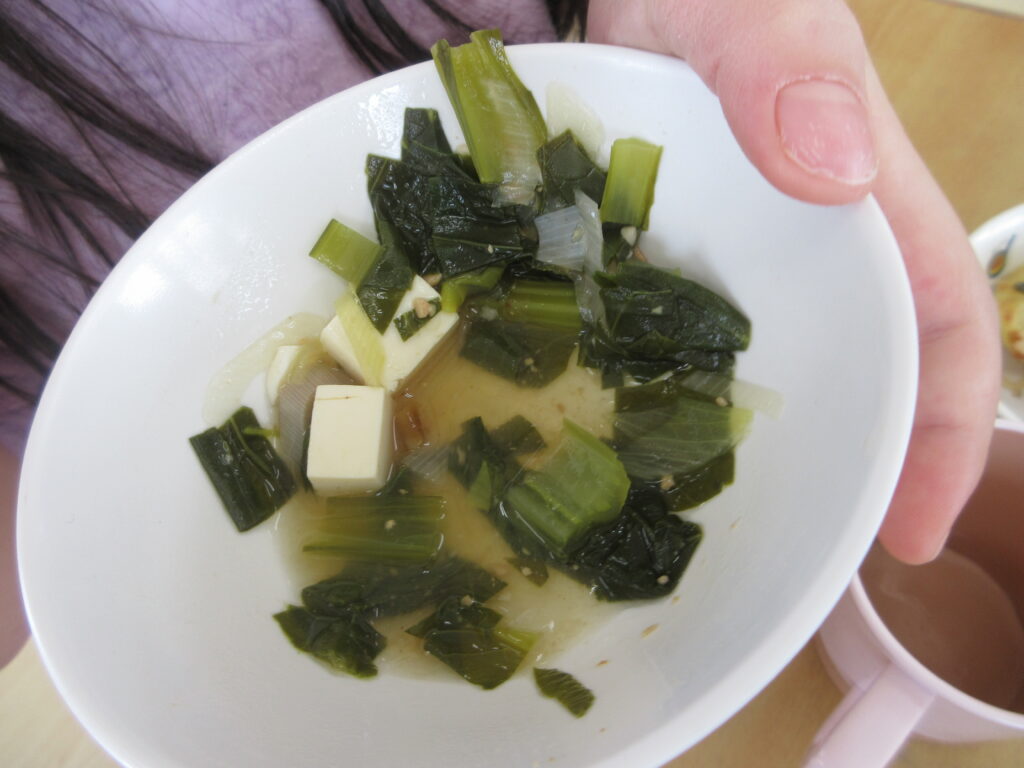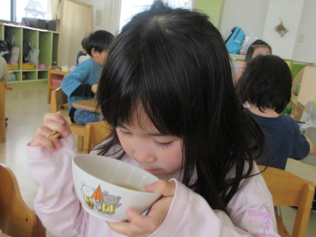 そして、給食では糀屋団四郎さんのみそを使ったみそ汁を食べました!普段とみそ汁の色が違うことに気づいたそら組さん。