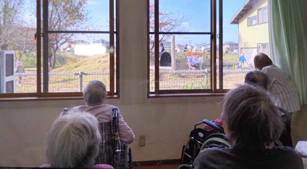 ショートステイの隣には保育園があり、お部屋の窓から園庭で元気いっぱいに遊ぶ園児さんたちが良く見えます