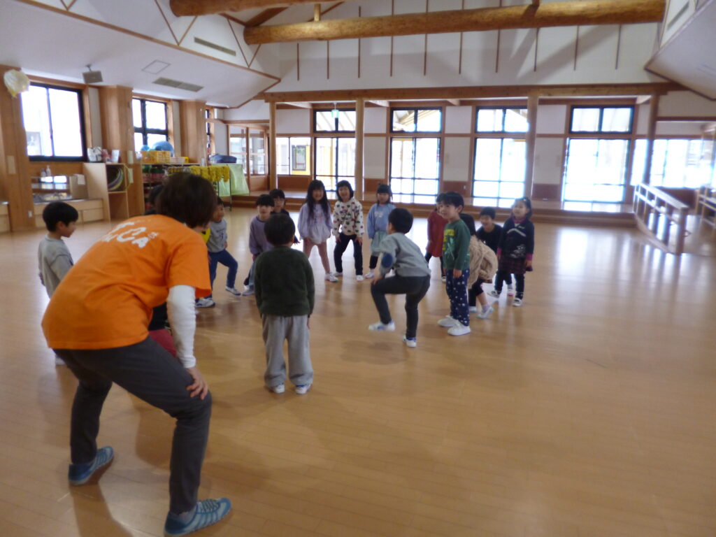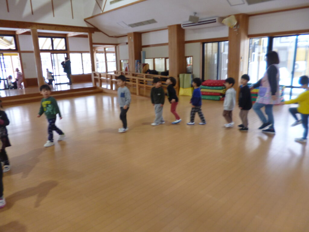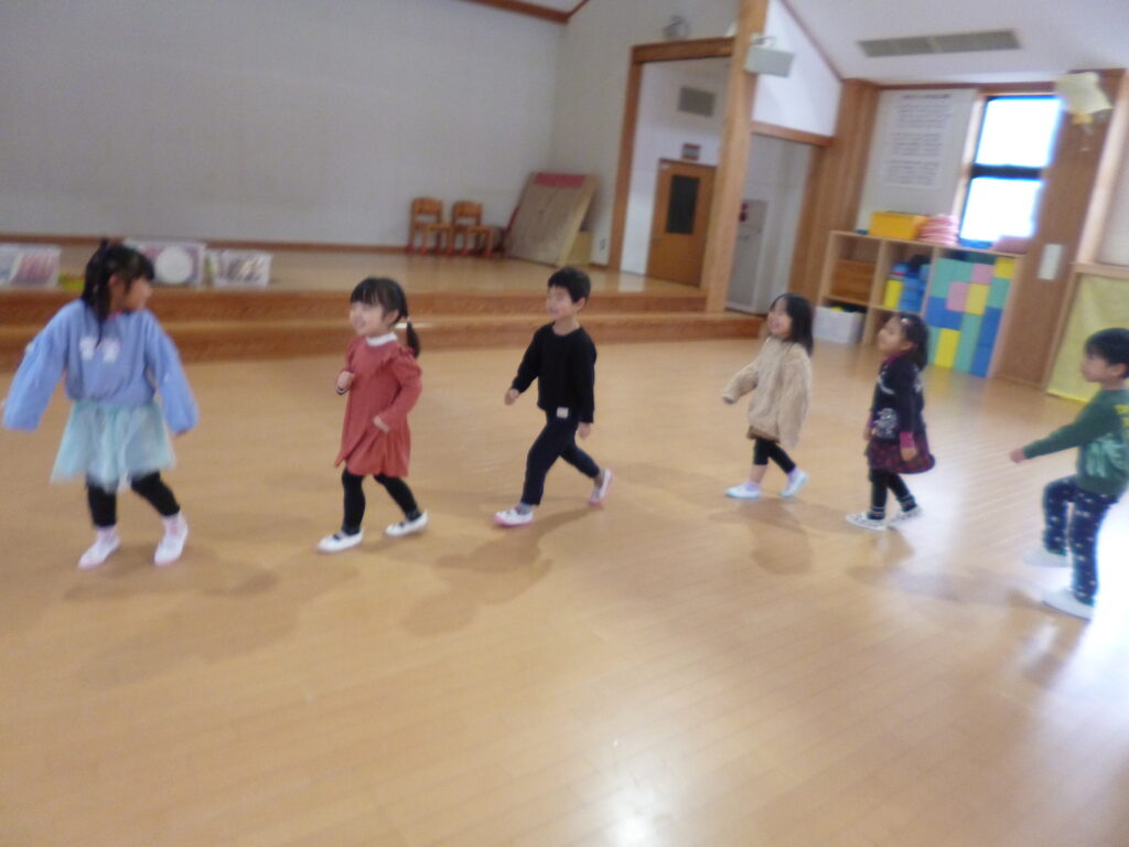 はじめは音楽に合わせて歩きます。ゆっくり歩いたり、どしん、どしんと足を踏み鳴らしながら歩いたりしました。音楽が止まると、歩くのもピタっと止まります。
