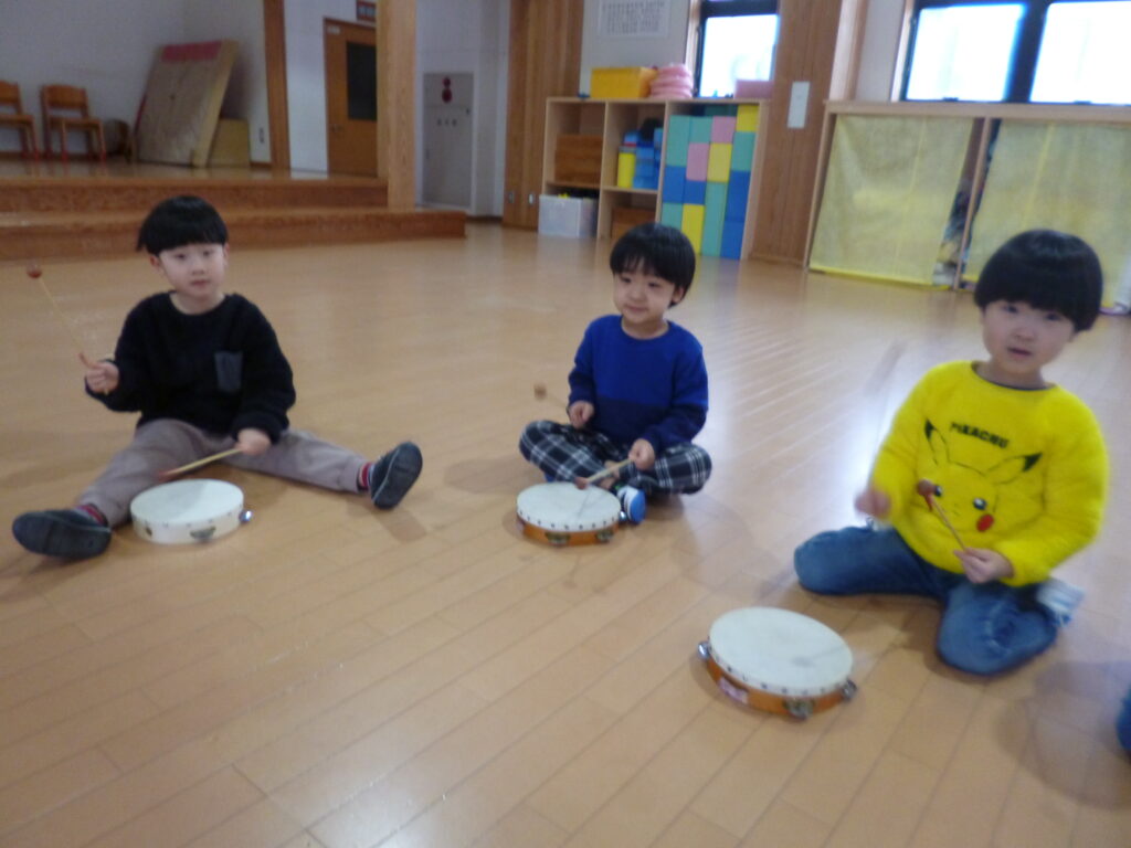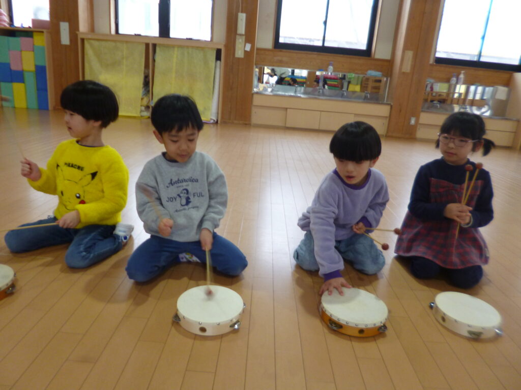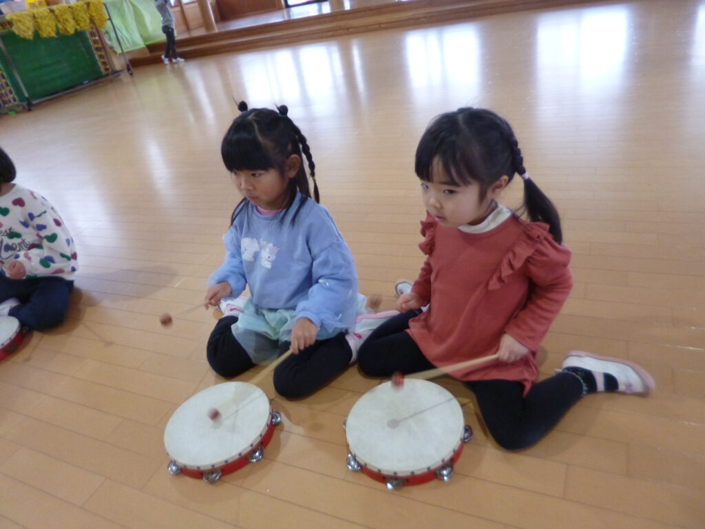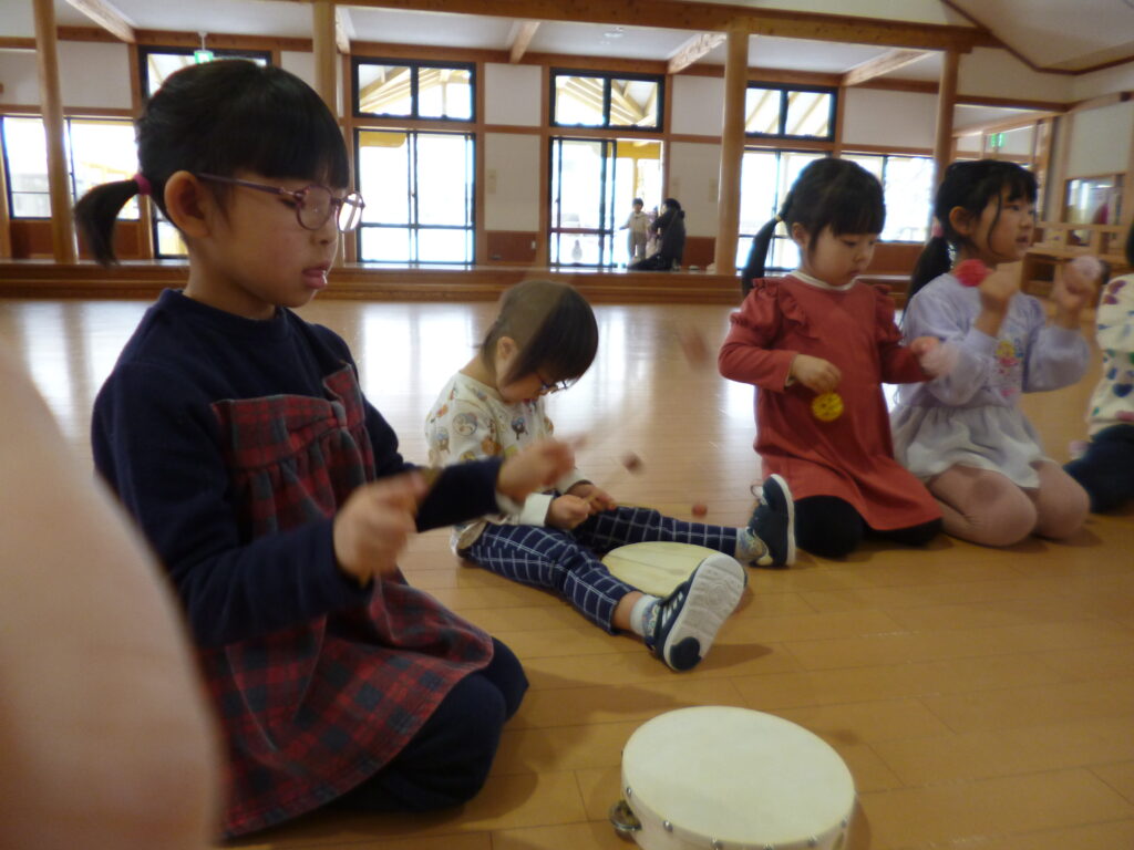 指や手首、腕を動かしたり、友だちとギッタンバッコン、太鼓をたたいたりと楽しんでいました。