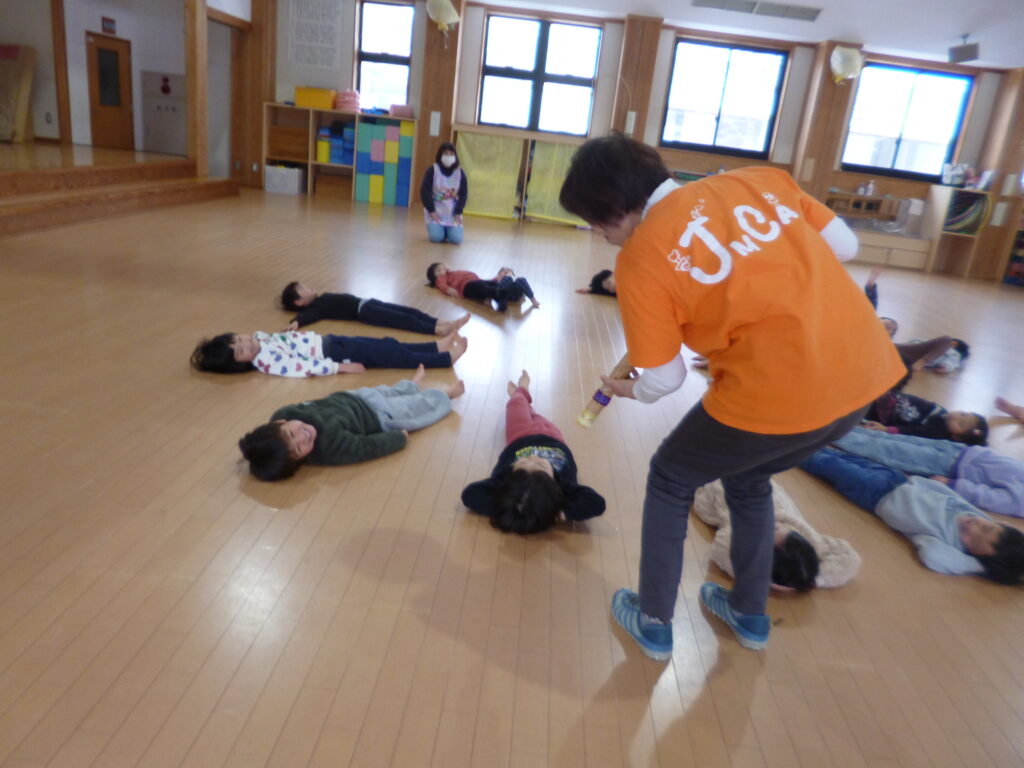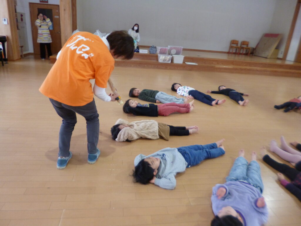 床に寝転がると、お友だちの近くで講師の先生が音の出る筒を持ってきて、傾けると自然と静かになり筒から出る音に耳を傾けていました。