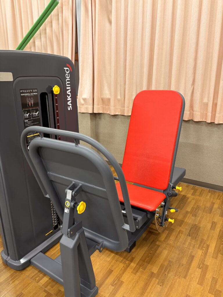 座った状態で足を前に伸ばすマシン。太ももの前側(大腿四頭筋)を集中的に鍛えられます。立ち上がり動作の改善に効果的です。