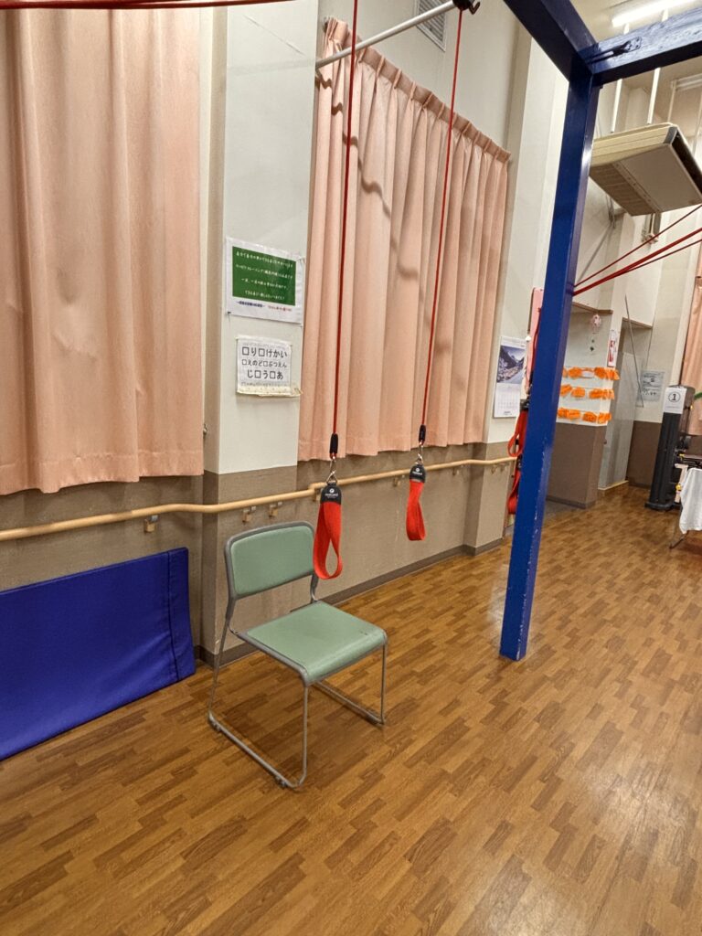 イスに座りながら、天井からぶら下がった2本のコードを握って、ゆっくりと身体を動かしていきます。前後左右に身体を伸ばした縮めたりしながら、身体のバランス能力が鍛えられます。