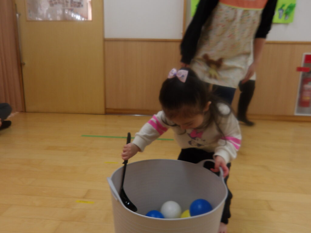 まずはお玉にボールを入れて落とさないようにするゲーム「ボール運び」を披露!