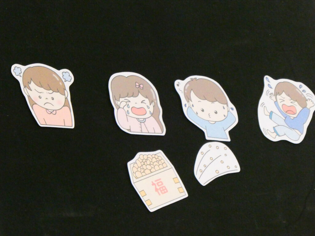 「節分ってどんな日?」と子どもたちに問いかけると「まめまきするひ」「おにがきてやつけるひ」と答えてくれました。そこでまずは節分の由来や、どんな日なのか節分のパネルシアターを見ました。節分は悪い鬼をやつけるだけでなく、自分の中にいる「怒りんぼ鬼」「泣きむし鬼」「知らんぷり鬼」「やだやだ鬼」などを豆をまいて追い出すという意味があることを知ると、自分の中にはどんな鬼がいるのかを考えていました。